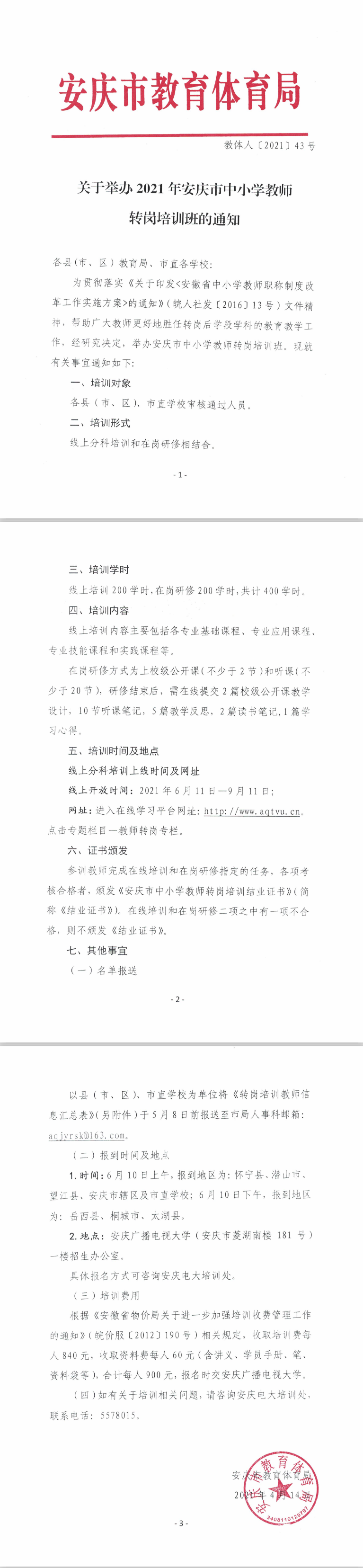 关于举办2021年安庆市中小学教师转岗培训班的通知