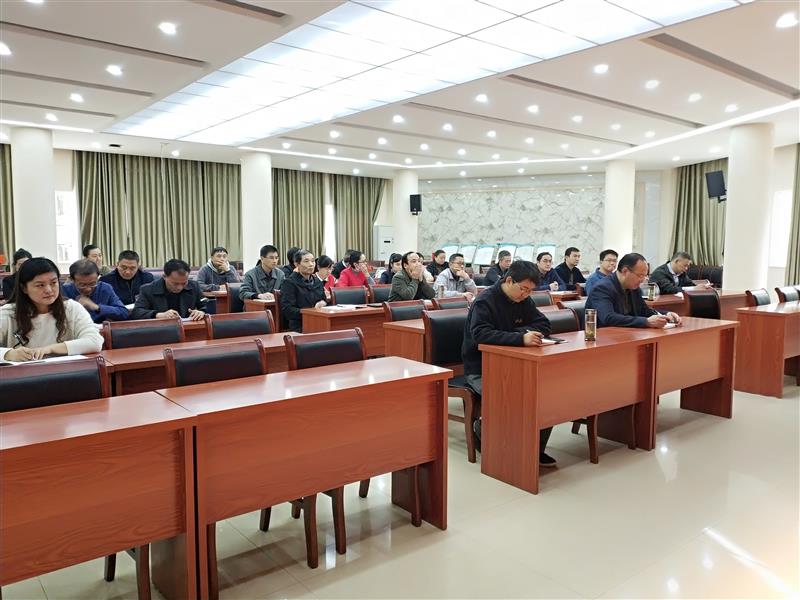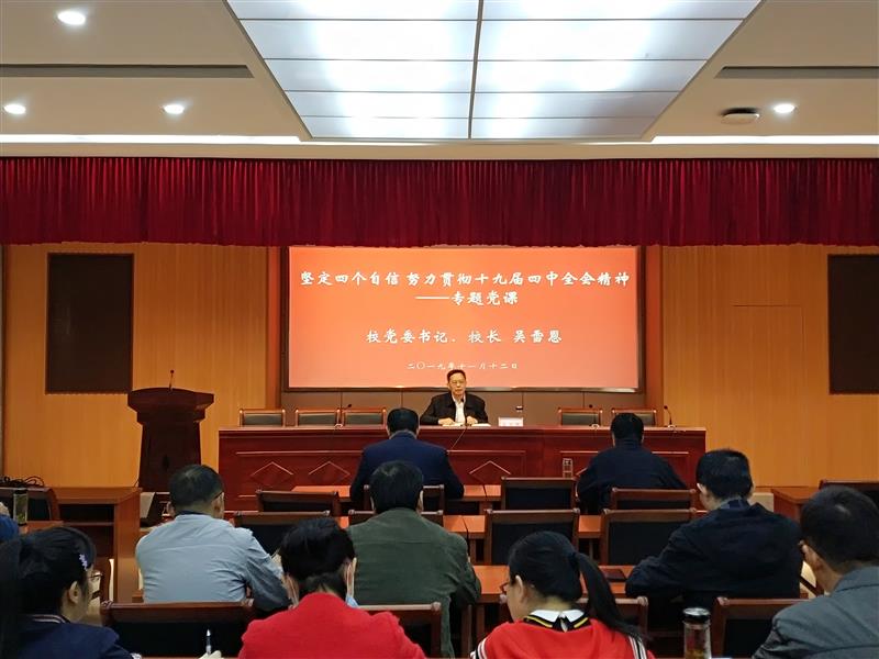 为深入学习贯彻十九届四中全会精神,扎实开展“不忘初心、牢记使命”主题教育, 11月12日下午,我校在C栋205会议室开展专题党课活动。党课主题为“坚定四个自信  努力贯彻十九届四中全会精神”,由校党委书记、校长吴雪恩授课。校党委委员、副校长周光纯,校党委委员、副校长王佩捷与全体党员、中层以上干部一起聆听了党课。