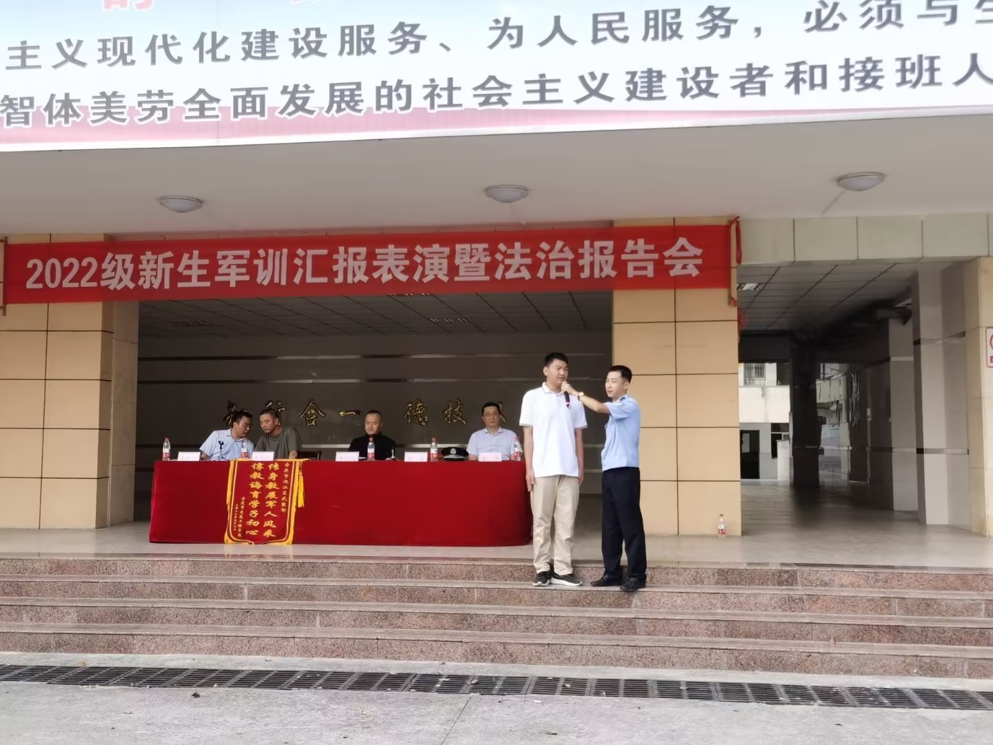 9月9日下午,安庆广播电视大学(安庆建校)2022级新生军训汇演暨法治报告会活动在学校操场隆重举行。校党委委员、副校长王付清,迎江区武装部王和平,华中路派出所副所长张鑫,校保卫处主任庞涛出席此次活动。活动由校团委书记、职教处负责人吴欢欢主持。