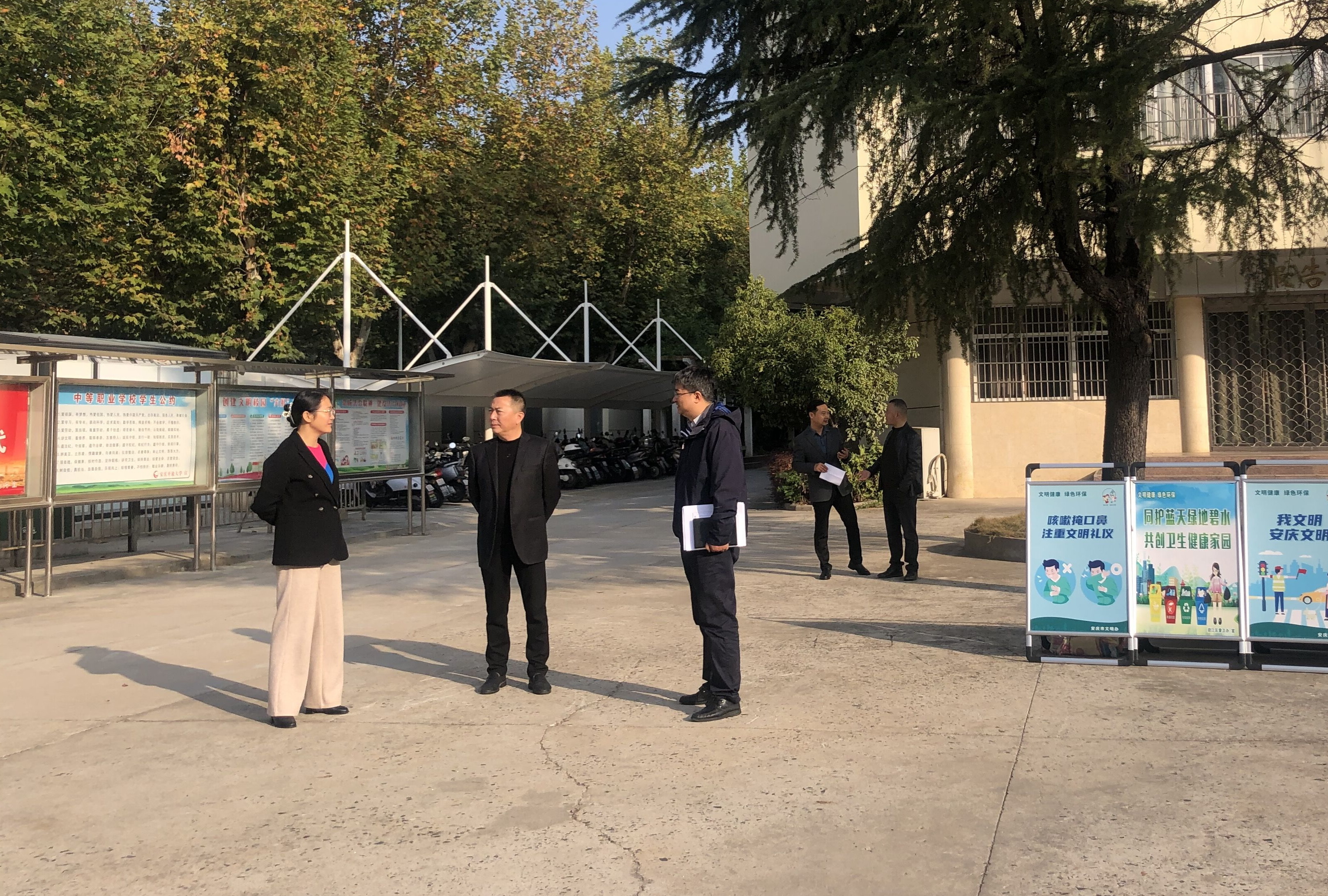 检查组一行实地察看了校园各处环境以及校园公益广告、宣传氛围等落实情况,并现场听取了我校创建工作情况的汇报。检查组一行对我校文明创建工作给予了肯定。