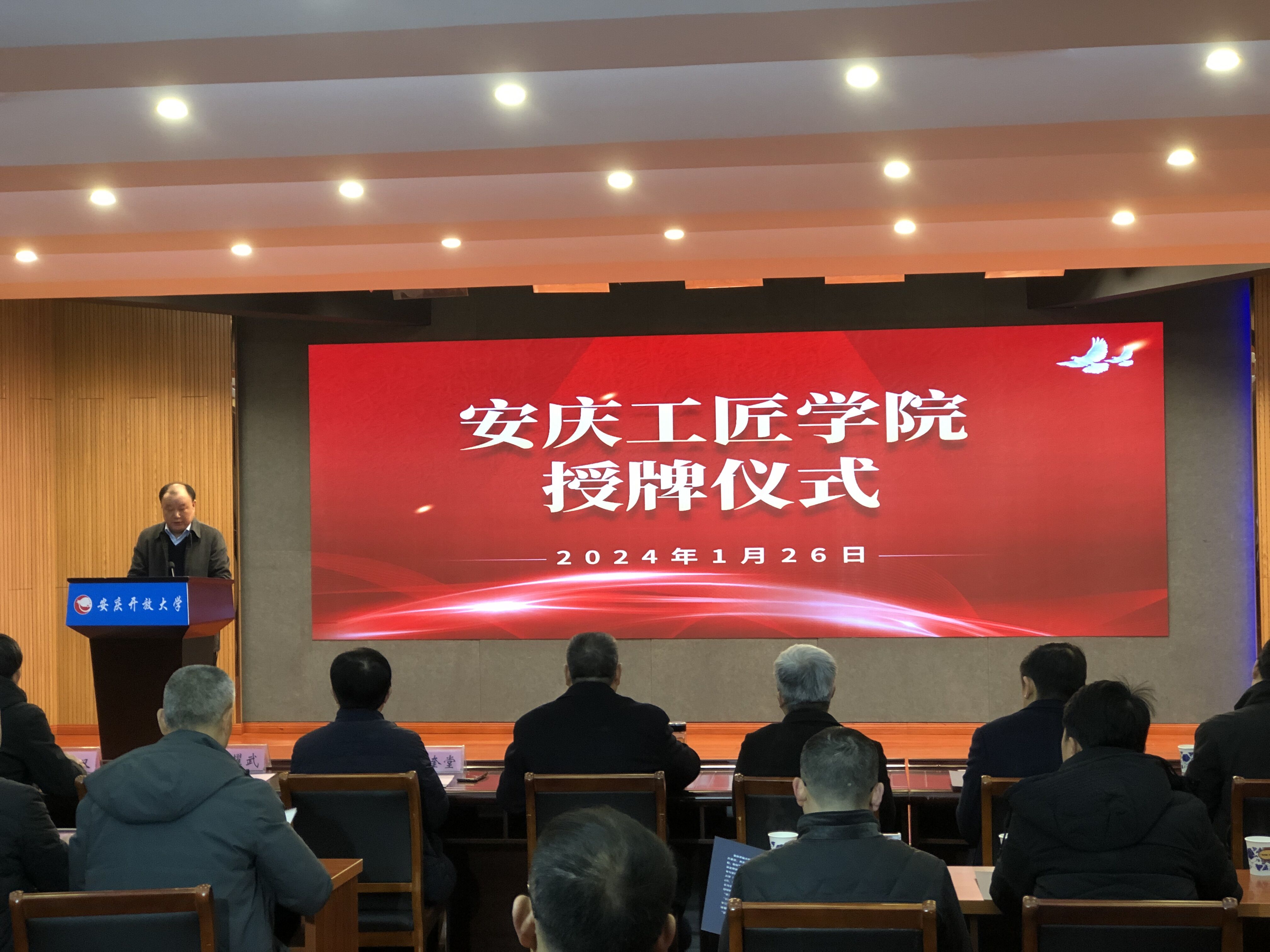 1月26日上午,安庆工匠学院授牌仪式在安庆开放大学举行。安徽省总工会党组成员、经审会主任曾传发,安庆市人大常委会副主任、市总工会主席姜奎堂,安庆市总工会党组书记、常务副主席王耀武,安庆市人社局党组书记、局长王志节,安庆市委教体工委副书记张复双,安庆市总工会党组成员、经审会主任阳传国,安庆开放大学党委书记、校长曹劲松,安庆开放大学党委委员、副校长王付清出席仪式。省、市总工会相关部门的领导、安庆开放大学师生代表和新闻媒体的朋友们参加了授牌仪式。