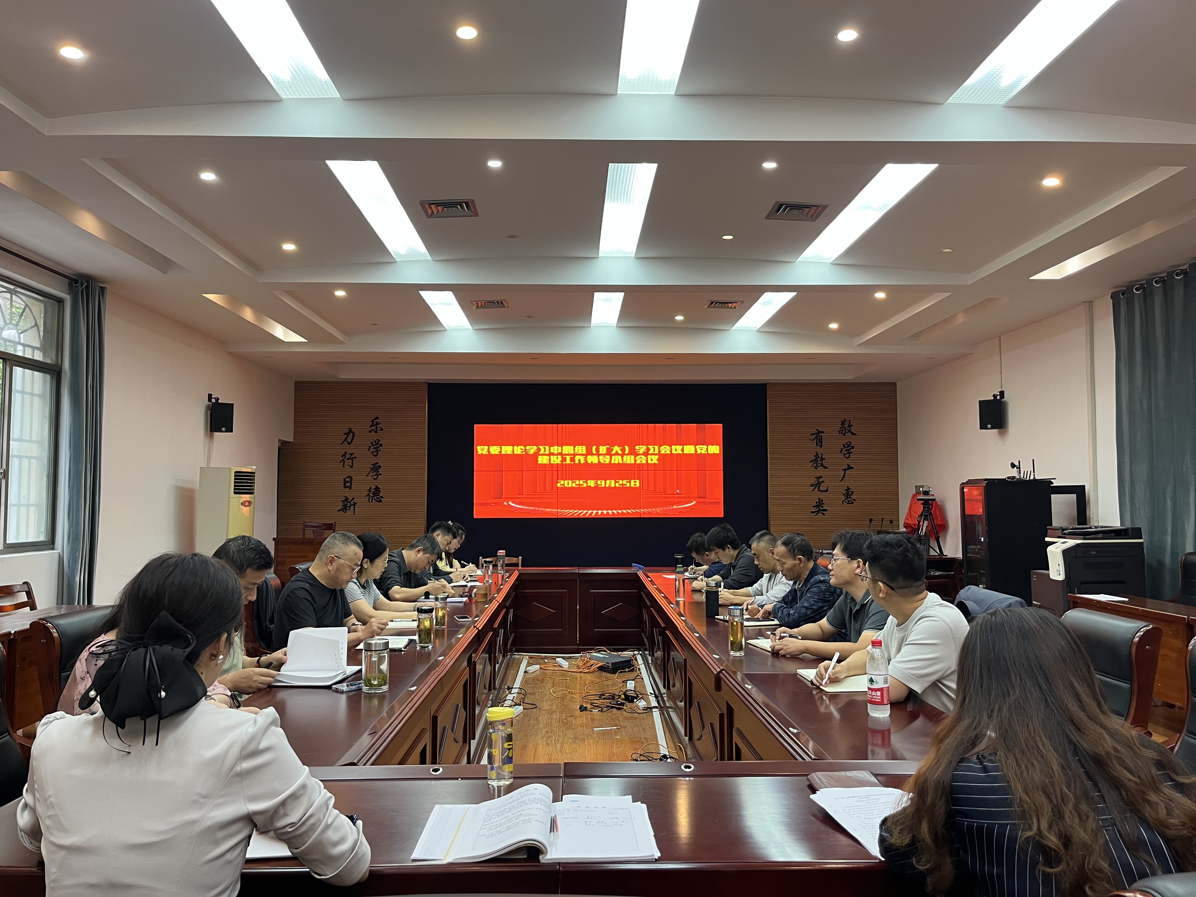 9 月 25 日上午,我校在 A104 会议室召开党委理论学习中心组(扩大)学习会议暨党的建设工作领导小组会议,传达学习习近平总书记关于学习教育的重要指示和中央党建工作领导小组会议,省委常委会扩大会议暨省委党的建设工作领导小组会议、省委十一届十次全会,以及市委常委会扩大会议暨市委党的建设工作领导小组会议精神,总结学校学习教育工作,研究部署作风建设常态化长效化工作。会议由陈庆玲主持,党委理论学习中心组成员、各支部书记、各部门负责人等参加了会议。