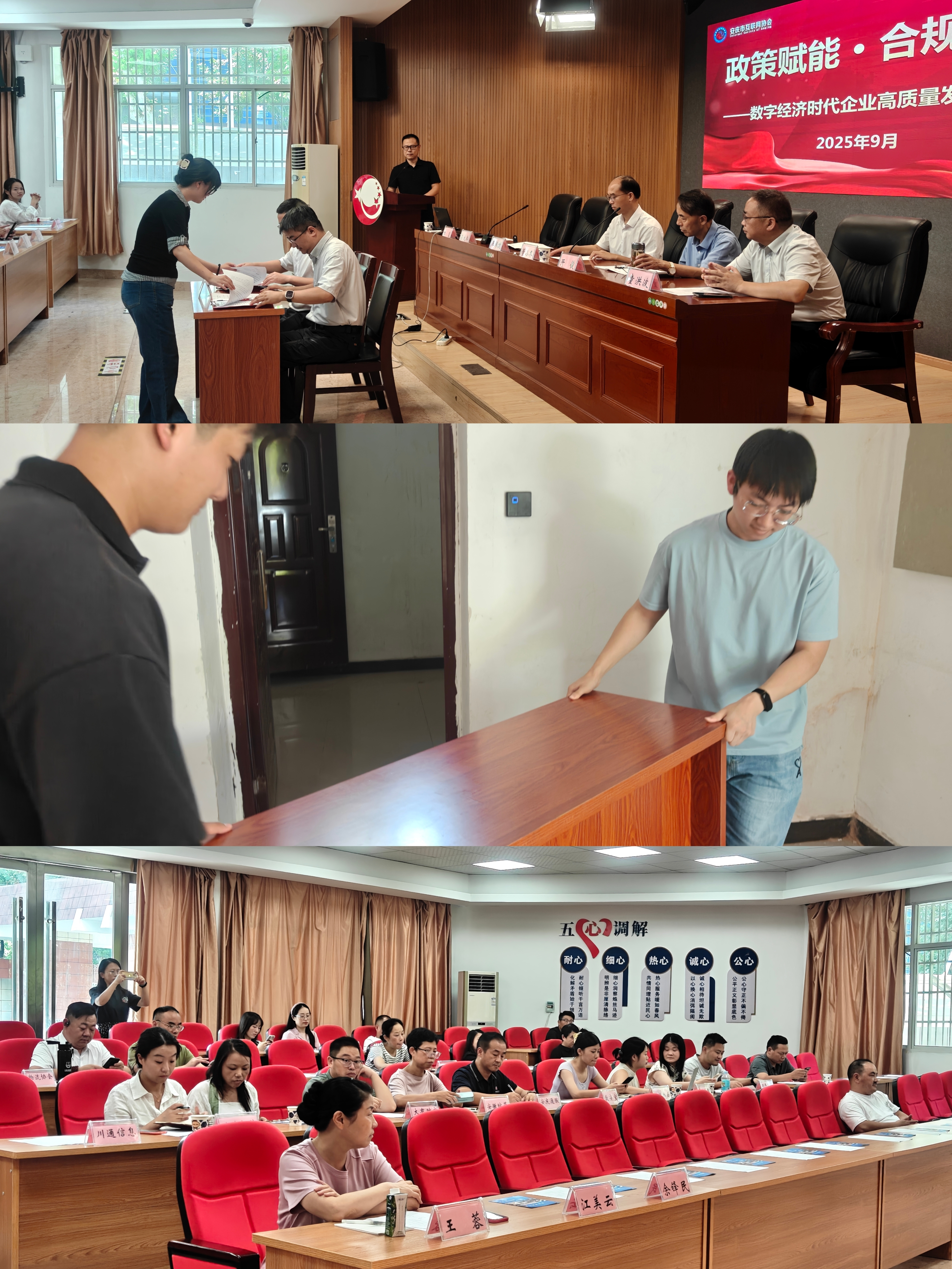 安庆开大二支部近年来逐步加强党建引领业务发展的力度,支部党员主要来自开放教育学院和考试与信息中心,借此合作签约之机,二支部党员主动服务企业高质量发展,承担起包括会场布置、资料分装发放、设备调试等各项准备和服务工作,积极与到场参加“政策赋能·合规护航——数字经济时代企业高质量发展研讨会”的市互联网协会成员单位沟通交流,充分做好开放教育学历提升和外接考试培训等相关业务的拓展宣传,为推动学校转型业务创新和校企融合发展谋求新机遇。