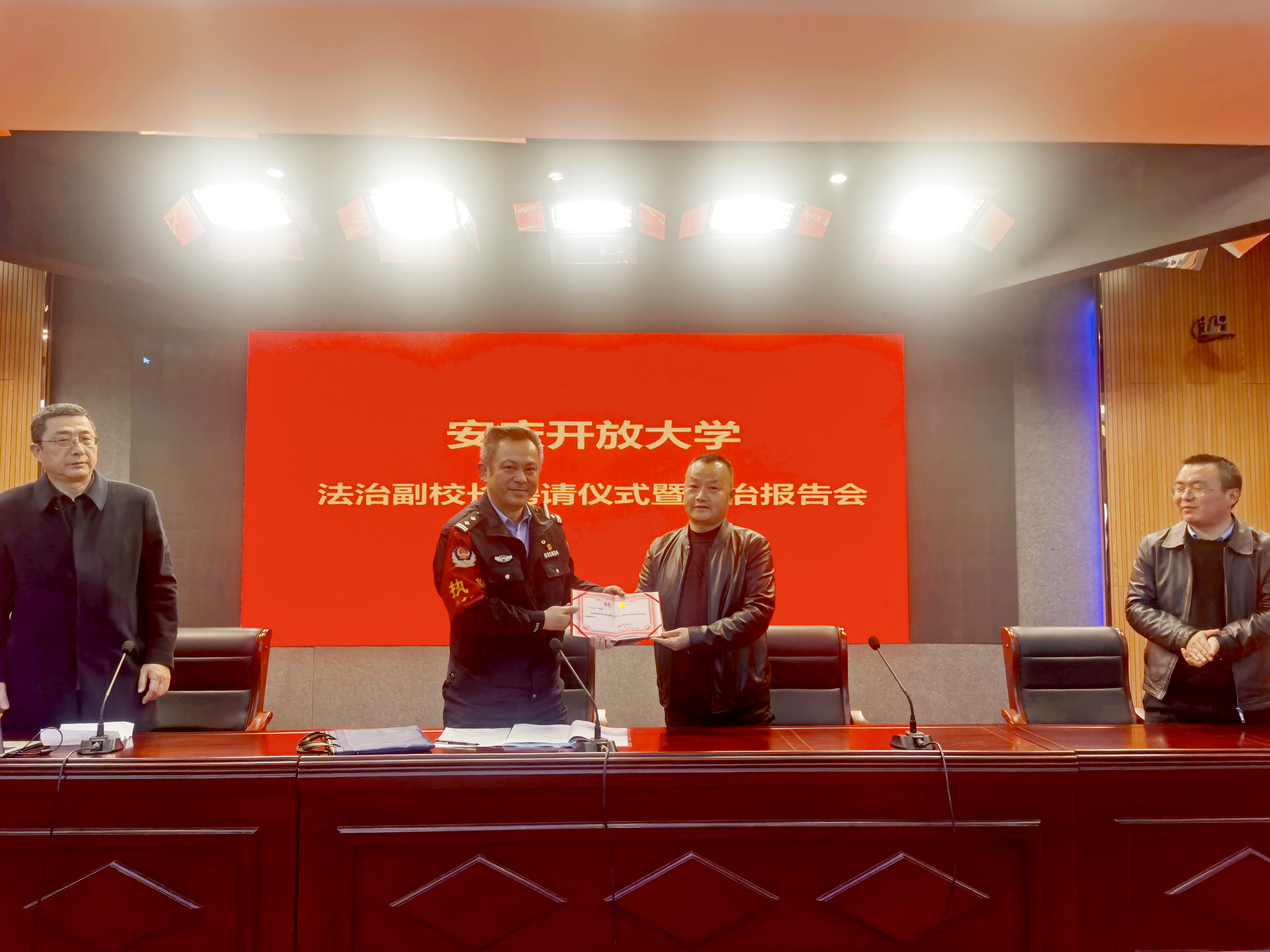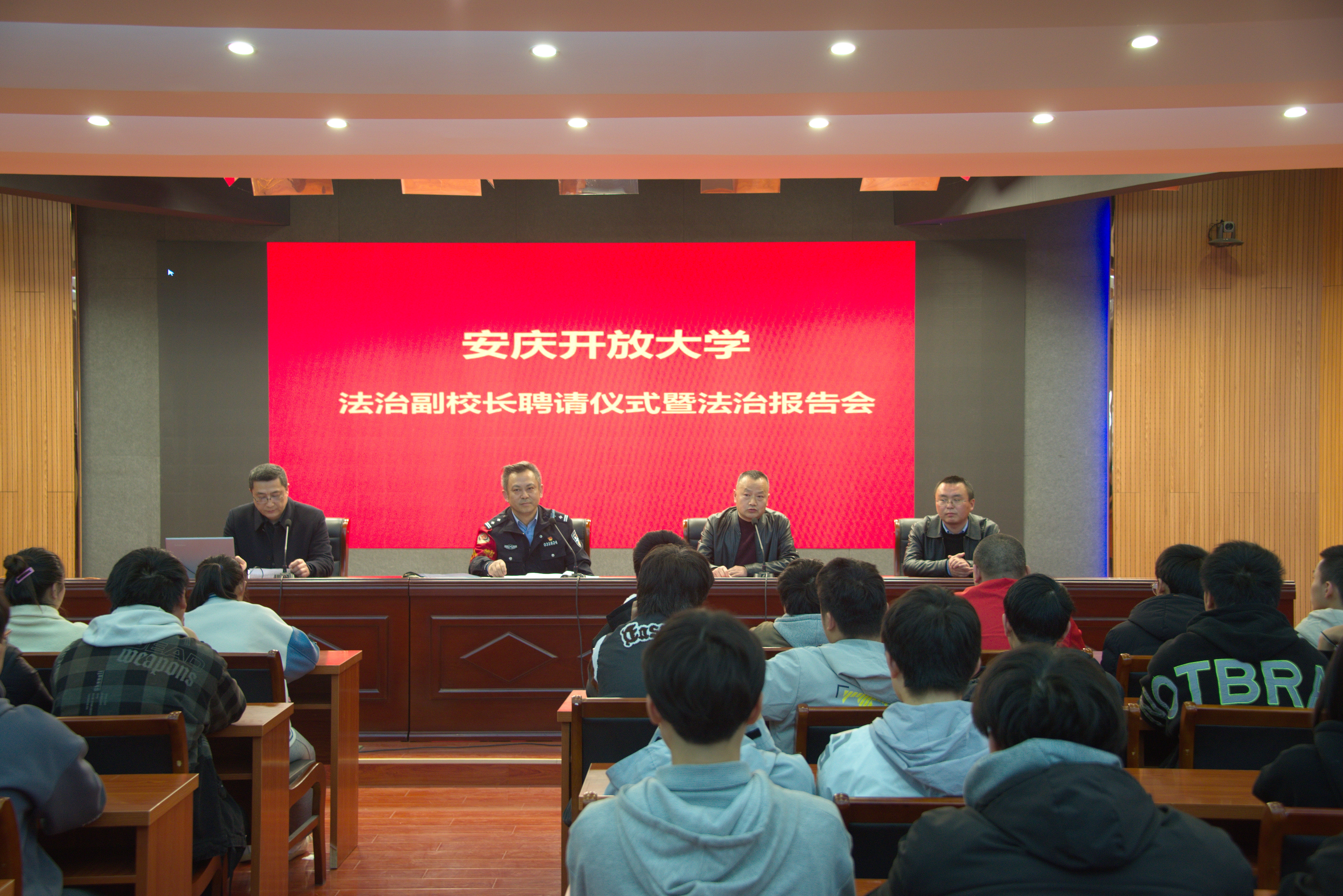 为提升学校法治建设水平,增强学生法治观念,构建和谐、文明校园,2023年3月8日下午,我校举行法治副校长聘书颁发仪式暨法治教育报告会。迎江公安分局华中路派出所教导员马忠东、校党委委员、副校长王付清,职成处主任吴欢欢、保卫处主任庞涛出席会议,在校二年级师生聆听了报告。