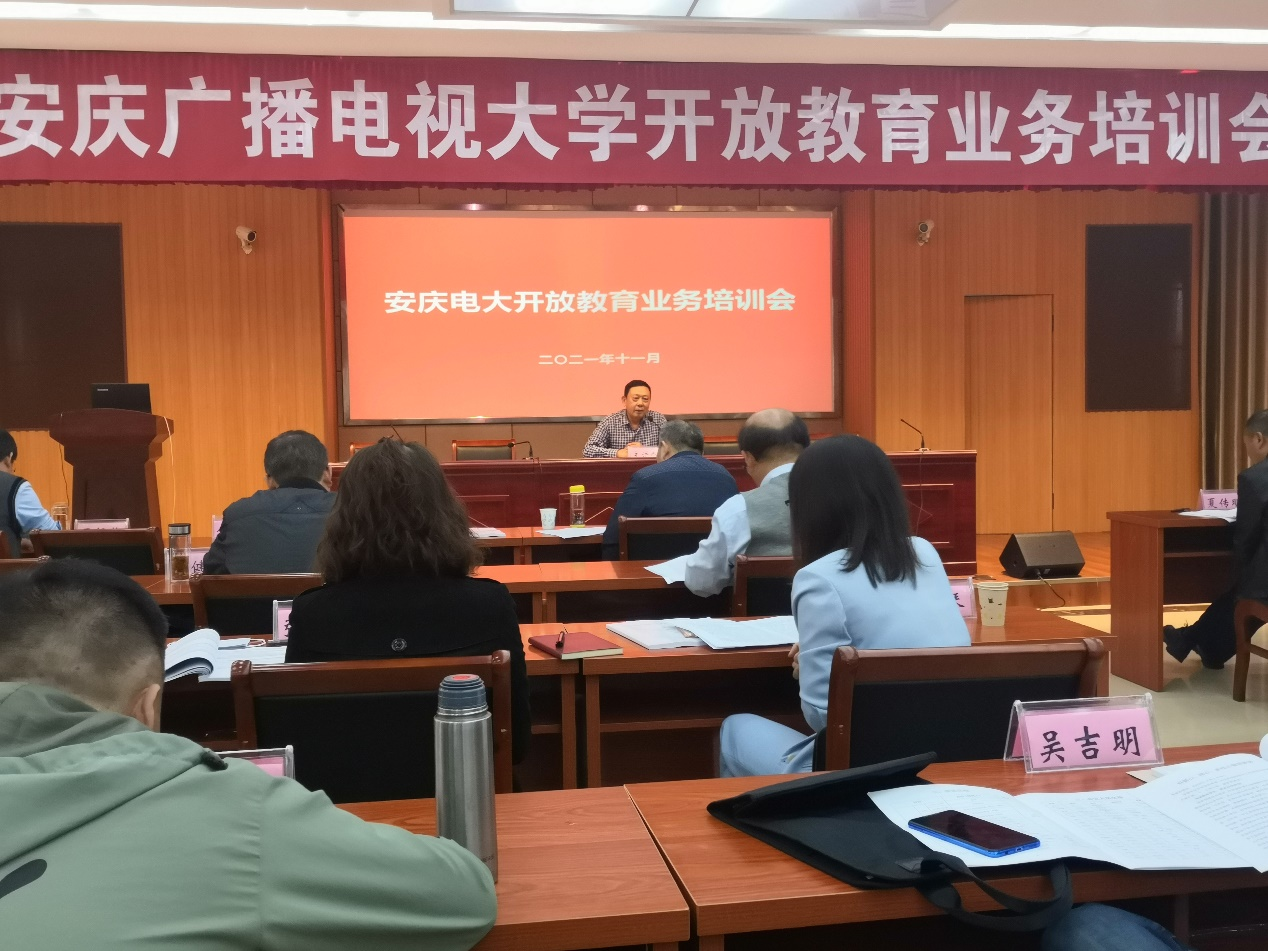 为迎接办学评估,进一步做好全市电大系统开放教育招生、教学教务管理工作,我校于11月4日-11月6日举办为期3天的全市电大系统开放教育业务培训班。市教体局调研员吴宗亚、校党委书记、校长曹劲松、校党委委员、副校长周光纯、许迪楼、王佩捷出席开班仪式。桐城、怀宁、潜山、岳西、太湖、望江和宿松7个县(市)教学点负责人及相关岗位老师参加培训活动
