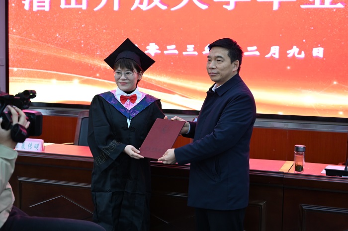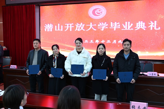 毕业典礼在庄严的国歌声中拉开序幕,大会宣读了《潜山开放大学2023秋毕业生毕业的通知》、《潜山开放大学关于2023秋获得学士学位的通知》,校领导向优秀毕业生代表颁发毕业证书和学士学位证书。