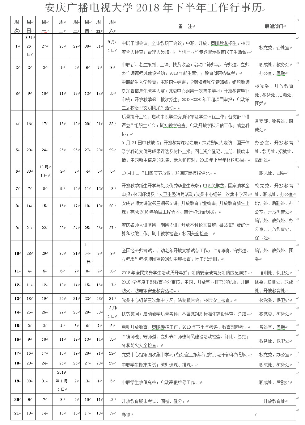 安庆广播电视大学2018年下半年工作行事历