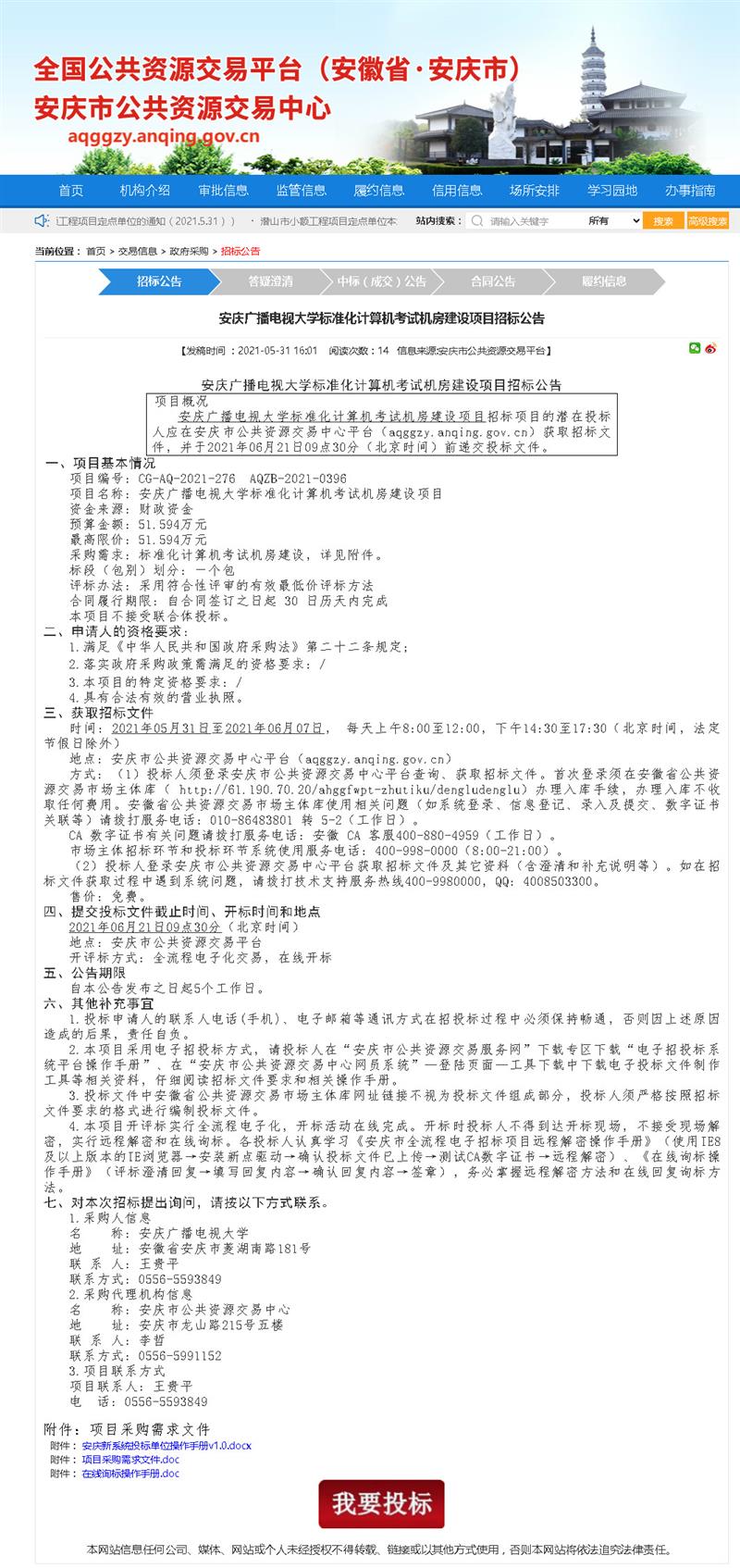 安庆广播电视大学标准化计算机考试机房建设项目招标公告