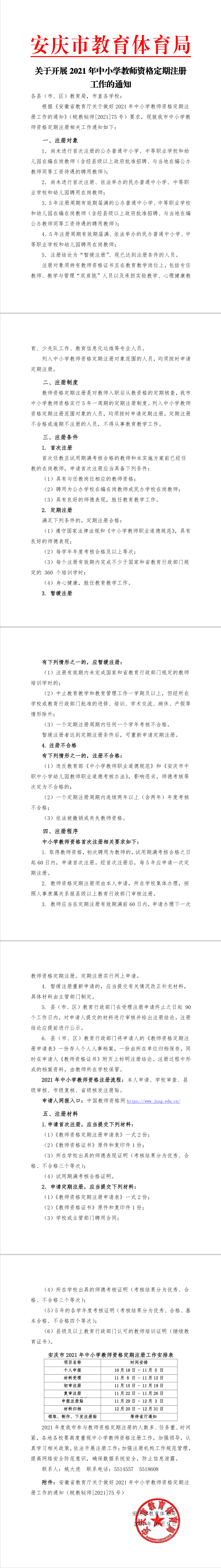 通知:根据《安徽省教育厅关于做好2021年中小学教师资格定期注册工作的通知》(皖教秘师[2021]75号)要求,请我校具有教师资格证书的教师,在11月5号之前完成注册工作( https://www.jszg.edu.cn/),注册好后下载打印《教师资格定期注册申请表》2份,并于11月12号之前连同教师资格证原件送到办公室洪光云处。