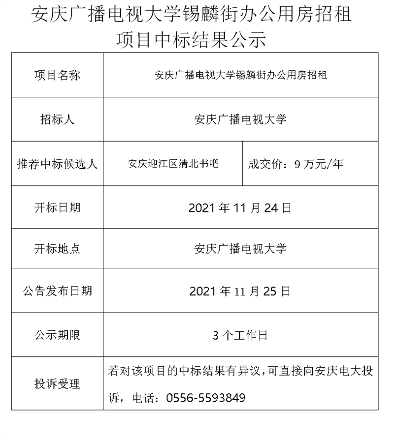 安庆广播电视大学锡麟街办公用房招租 项目中标结果公示