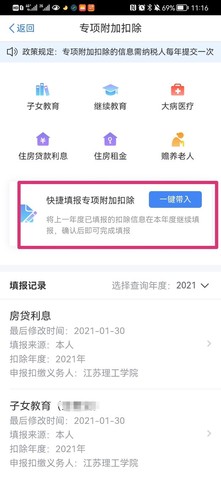2.点击“快捷填报专项附加扣除一键带入”,选择扣除年度2022年,弹出“将带入2021年度信息,请确认是否继续”,点击确认。