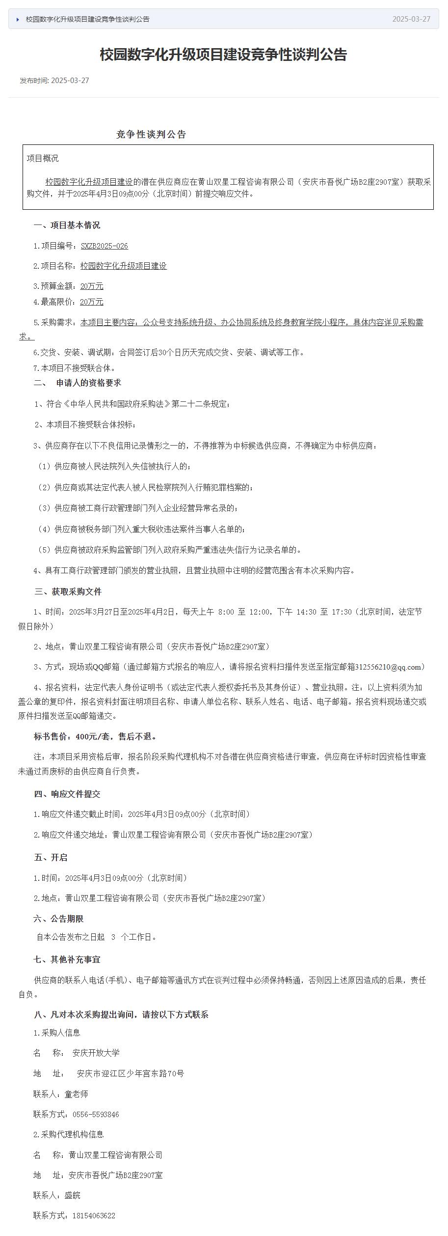 校园数字化升级项目建设竞争性谈判公告