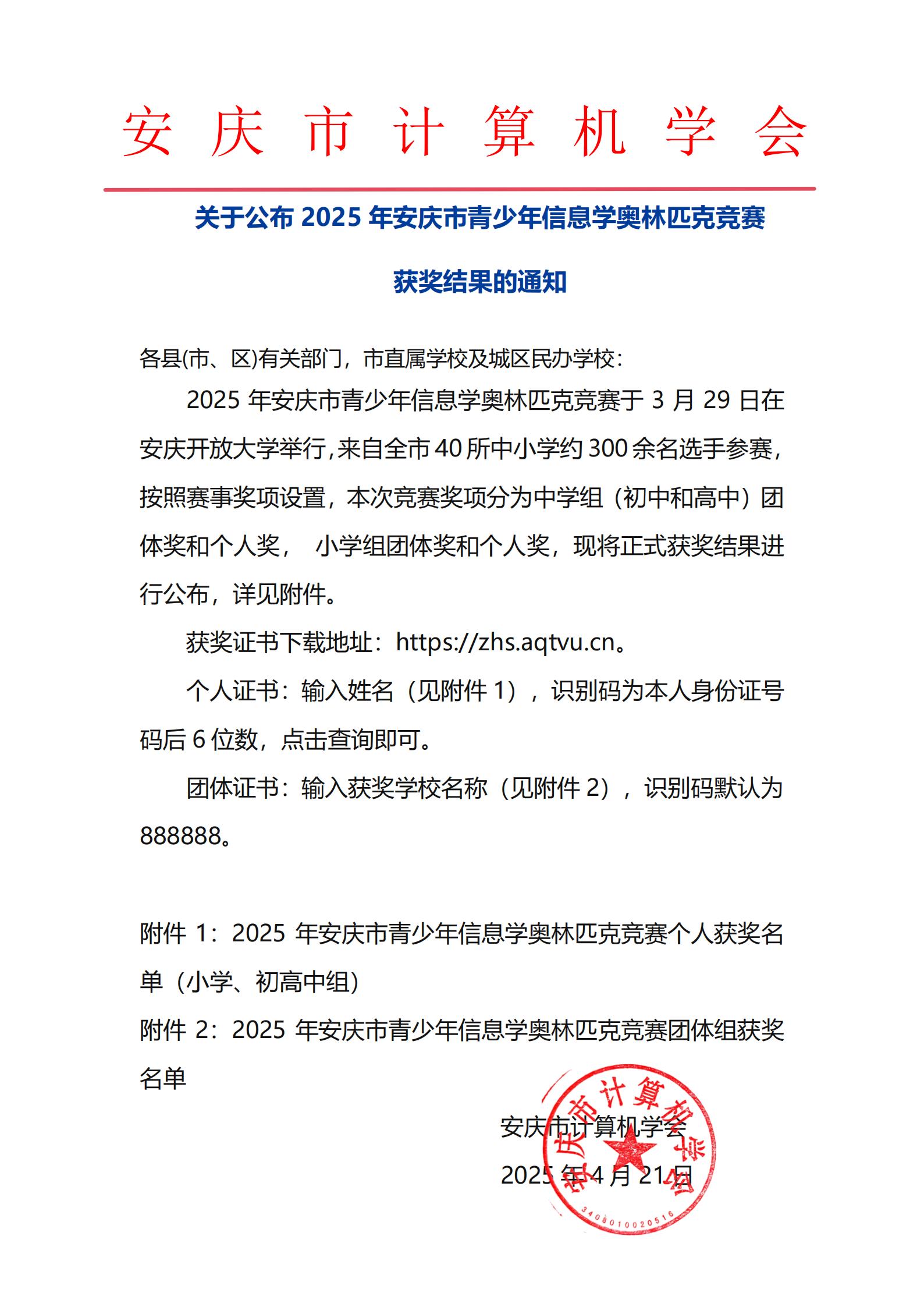 关于公布2025年安庆市青少年信息学奥林匹克竞赛获奖结果的通知
