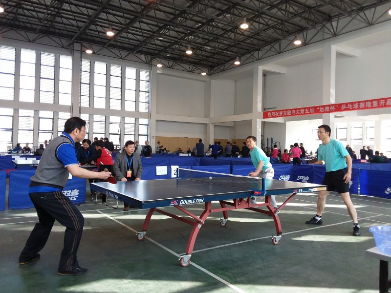 安徽电大系统第五届“远教杯”乒乓球赛于11月10日至11日在省校开赛。来自全省电大系统的19个代表队、近180名运动员参加了校长团体、教职工团体、男子单打和女子单打等四个项目的比赛。我校组建了由刘剑亚、吴祚录、王友星、温保民等四人为队员的比赛队伍,工会主席庞波带队参加了比赛。
