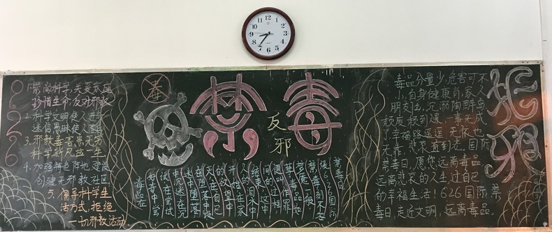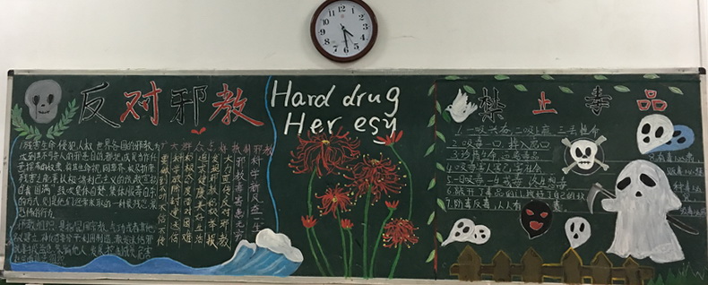 在黑板报制作中,各班班主任高度重视,全体同学积极参与并投入了极大的热情。黑板报以“禁毒防毒反邪教”为主题,内容丰富多彩,版式多样,图文并茂,从不同的角度宣传了毒品的危害和防毒知识,深刻揭露了邪教反科学、反社会、反人类,假善良、真残忍的邪恶本质。11月15日下午,校团委组织学生开展了“禁毒防毒反邪教”黑板报检查评比活动。
