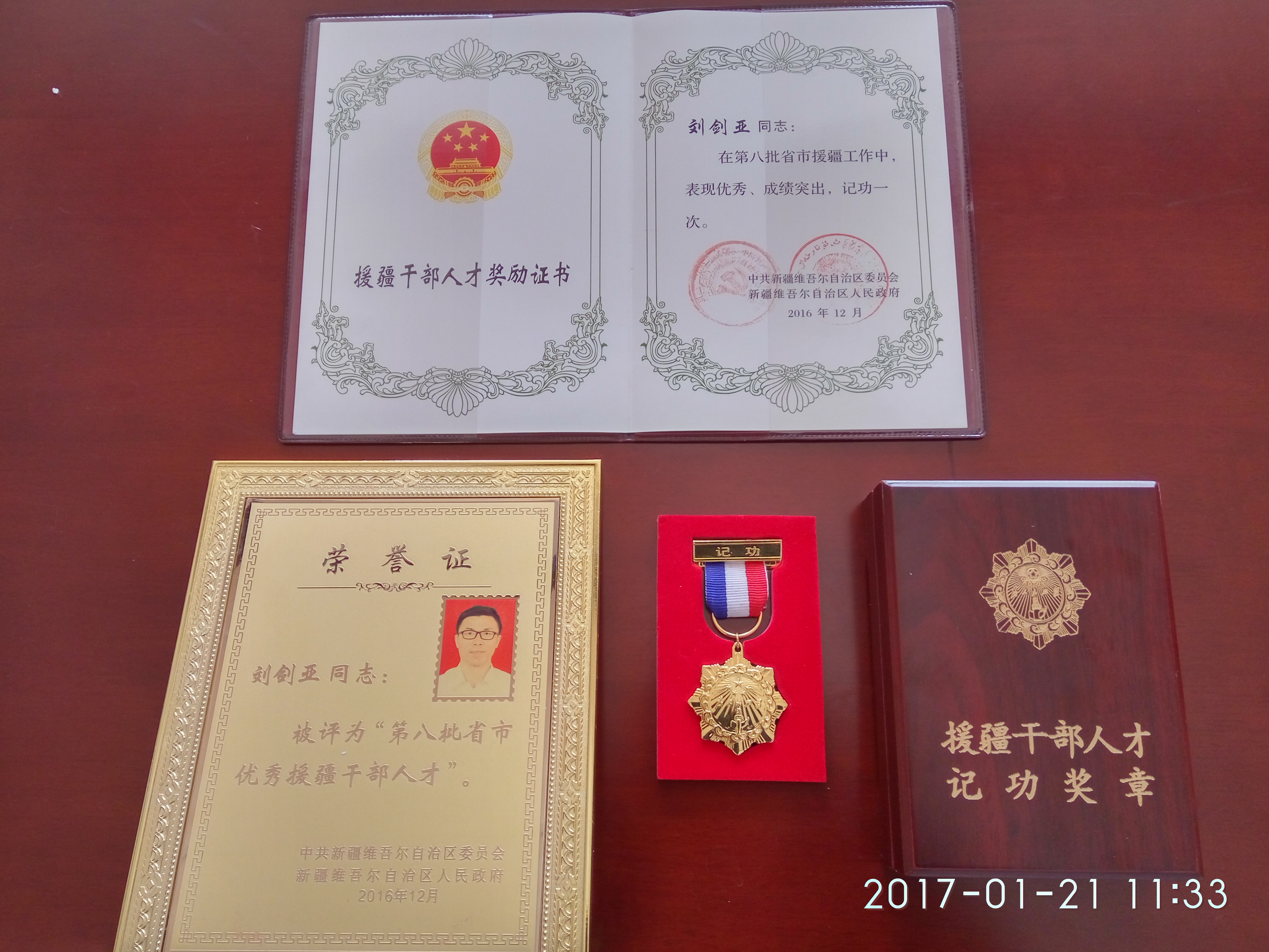 2016年12月27日,在新疆维吾尔自治区党委、政府召开的第八批省市援疆工作总结表彰暨第九批省市援疆干部骨干欢迎大会上,我校援疆支教教师刘剑亚同志荣获“第八批省市优秀援疆干部人才”表彰,并记功一次,授记功奖章一枚。