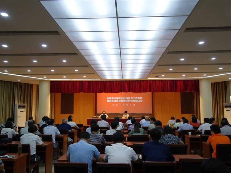 8月15日上午,安庆市中等职业教育重点工作布置暨有关信息化管理平台使用培训会在我校召开。会议由市教体局职成教科科长吴葵阳主持,各县(市)教育局职成教科长和全市中职学校校长、质量提升工程负责人、学籍管理员和信息平台管理员共100余人参加会议。