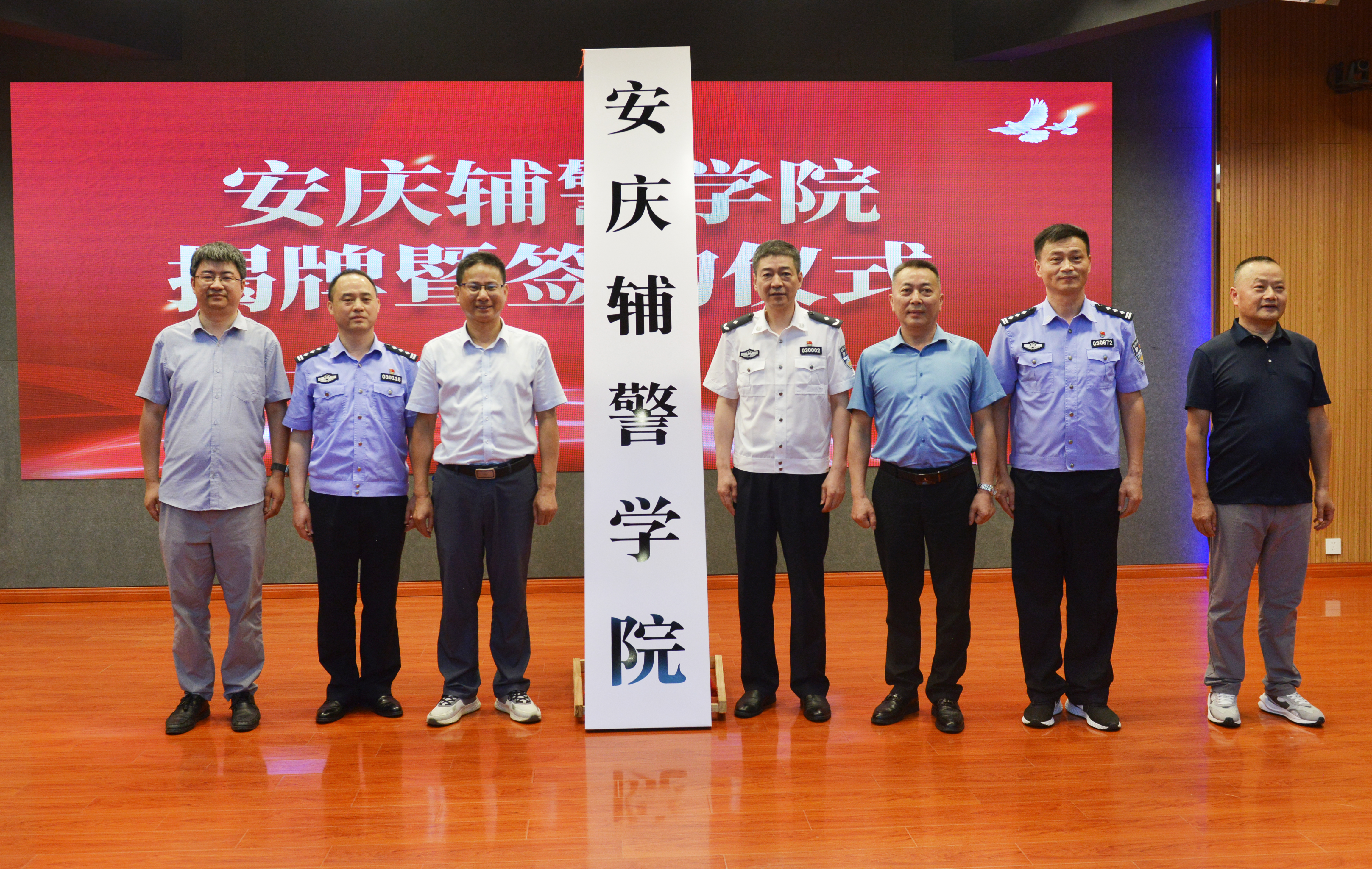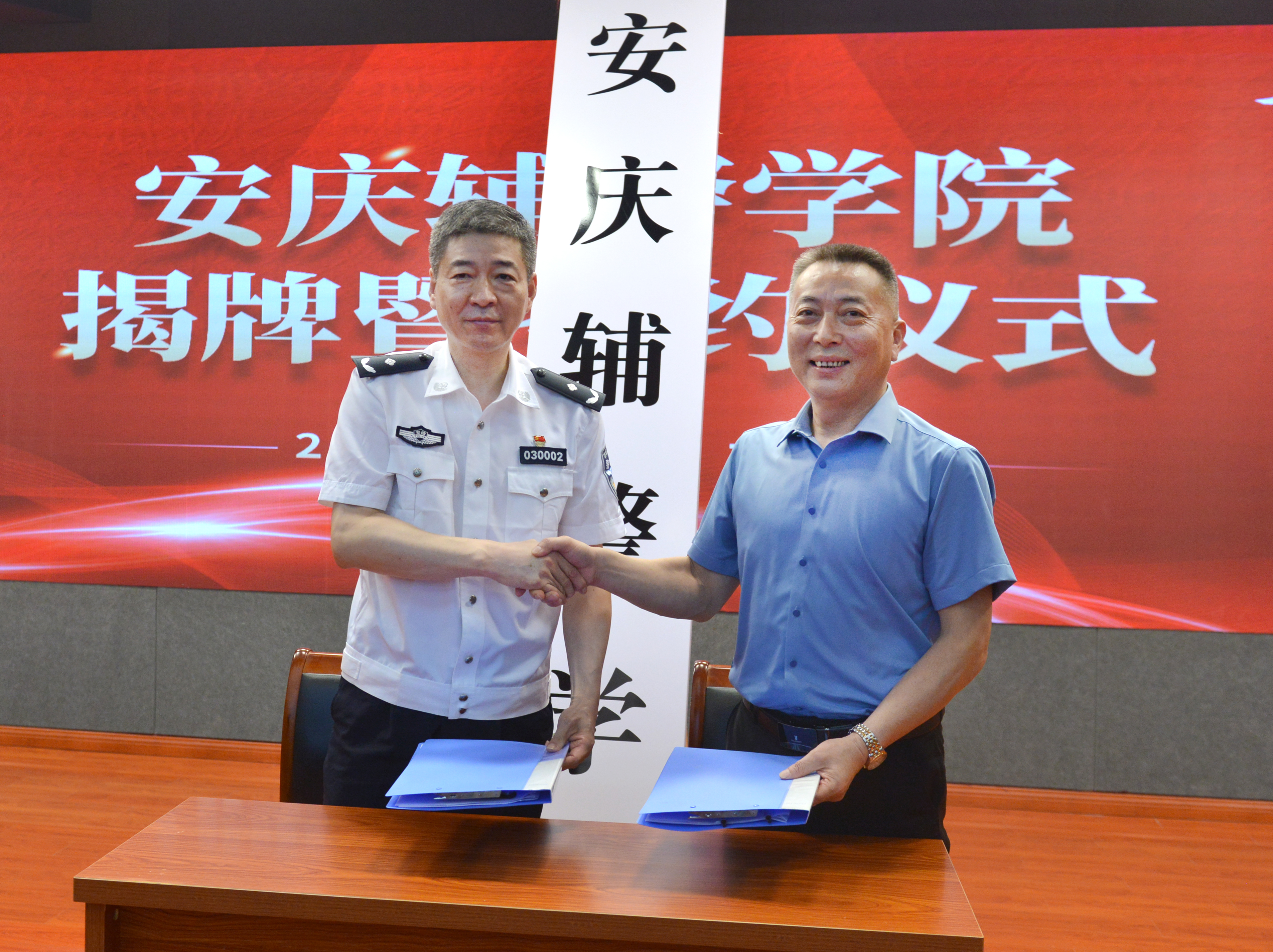 安庆市公安局党委副书记、常务副局长潘传六和安庆市委教体工委副书记张复双共同为“安庆辅警学院”揭牌。双方领导代表安庆市公安局、安庆开放大学签约。
