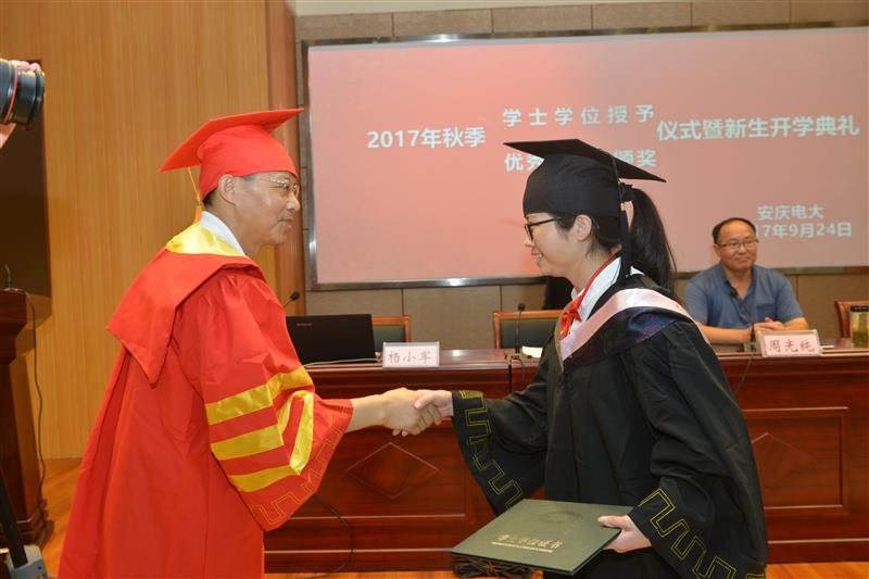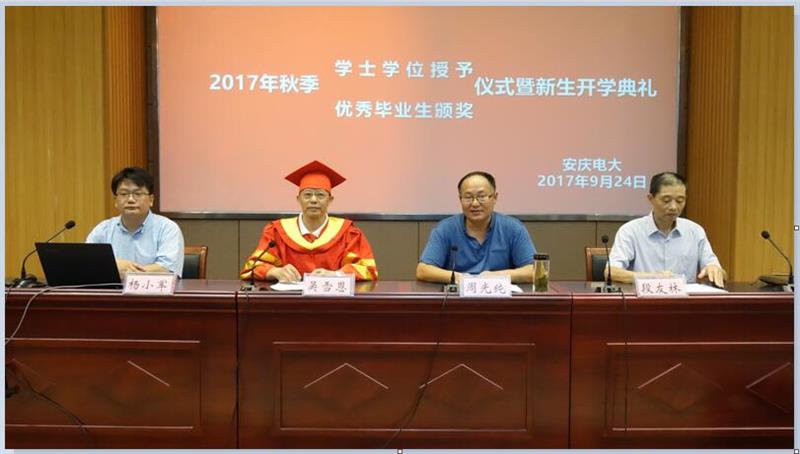 9月24日,在全市共创文明城、喜迎十九大之际,我校隆重举行了开放教育2017年秋季学士学位授予仪式、优秀毕业生颁奖仪式暨开放教育新生开学典礼。校党委书记、校长吴雪恩,副校长周光纯,教务处主任段友林,开放教育处主要负责人杨小军出席,相关处室工作人员、各新生专业辅导员和获得学士学位与2016年度优秀毕业生荣誉称号的学员、近800名市直新生参加了典礼。会议由副校长周光纯主持。会议采用校园网络系统现场直播方式进行,主会场设在C楼205报告厅,7个分会场设在各班教室。