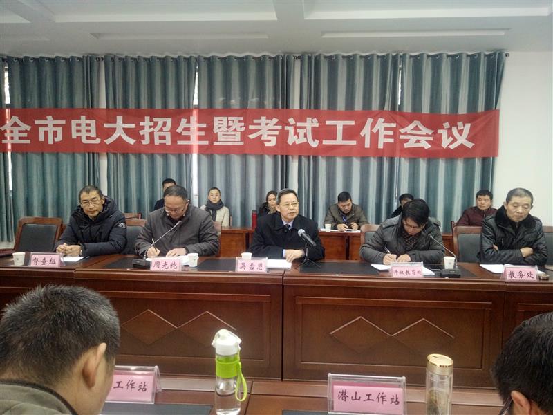 1月12日上午,全市电大系统招生暨考试工作会议在A楼104会议室举行,校党委书记、校长吴雪恩和副校长周光纯出席,六县(市)电大工作站站长、分校相关部门负责人、派驻县站巡考老师和县站教学、教务、招生负责人参加了会议。会上,开放教育处主要负责人杨小军总结了2017年度招生情况,结合上级电大相关会议精神,对2018年开放教育春季招生和本学期期末考试工作进行了安排。校党委书记、校长吴雪恩强调:一要统一思想、提高认识、抓好作风建设;二要严格落实考试工作责任制;三要规范考试工作操作流程,按规矩办事;四要做好突发事件的预防和处置工作。同时,吴校长对分校巡考人员提出了严格要求。
