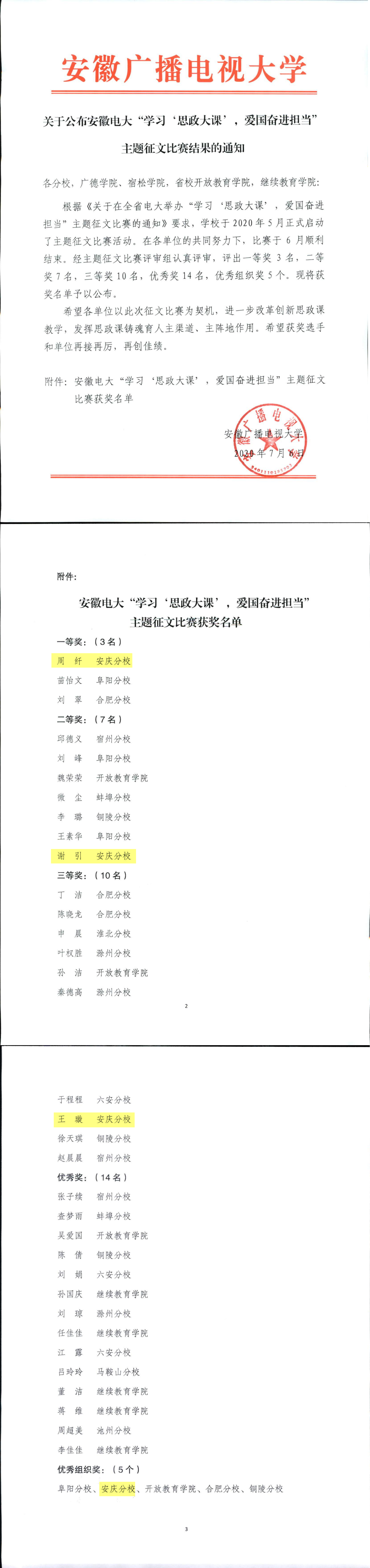 在刚刚结束的安徽电大“学习'思政大课',爱国奋进担当”主题征文比赛中,我校周纤同学荣获一等奖,谢引同学获二等奖,王璇同学获三等奖。学校获优秀组织奖。