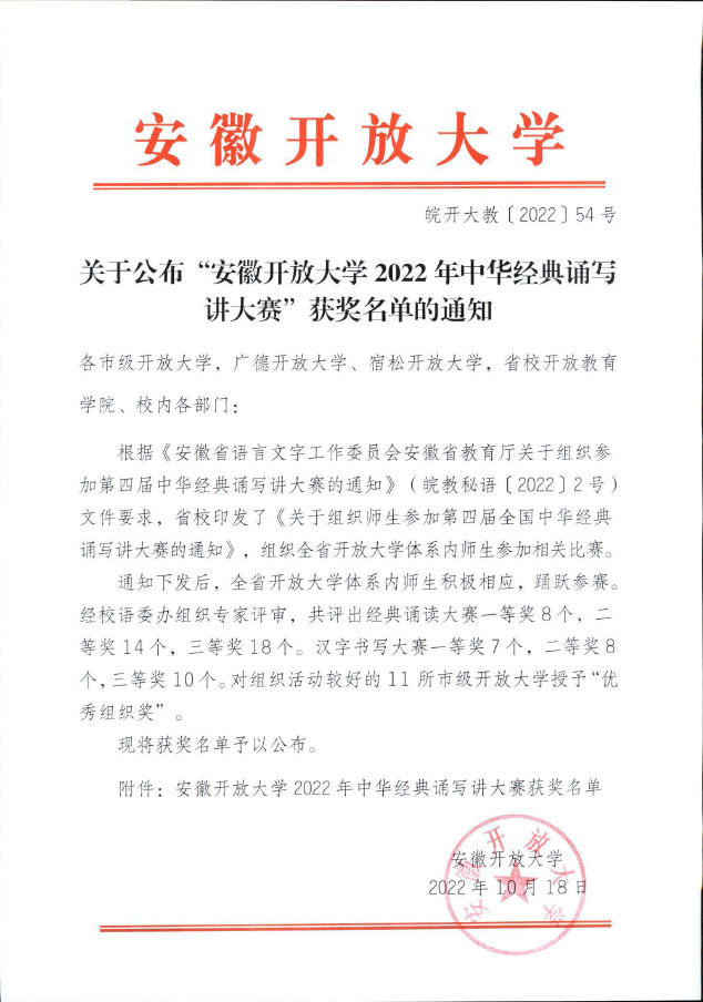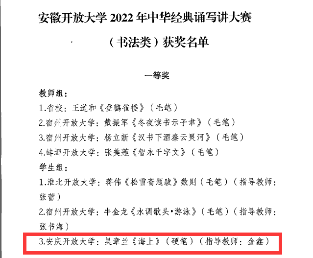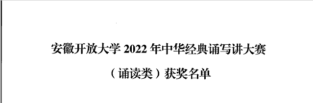 近日,安徽开放大学2022年中华经典诵写讲大赛成绩火热出炉,安庆分校经过赛前广泛动员、积极筹备,在师生的共同努力下,取得了骄人的赛绩。