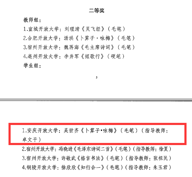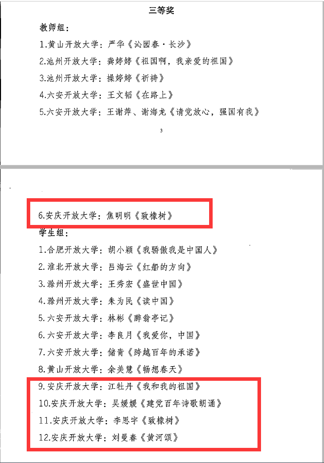 此外我校焦明明老师的诵读作品《致橡树》获教师组三等奖,安庆分校也以出色的整体表现收获优秀组织奖。