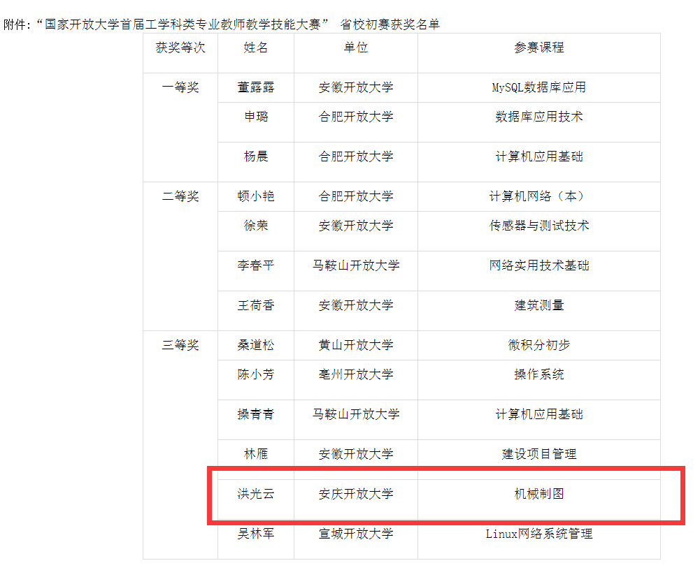 安徽开放大学于近日公布了2022年“国家开放大学首届工学科类专业教师教学技能大赛”省校初赛获奖名单,在此次全省办学体系内的专业教师角逐中,安庆开放大学洪光云老师参赛课程《机械制图》荣获三等奖。