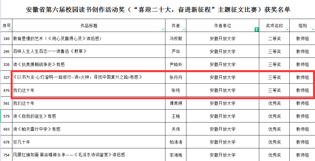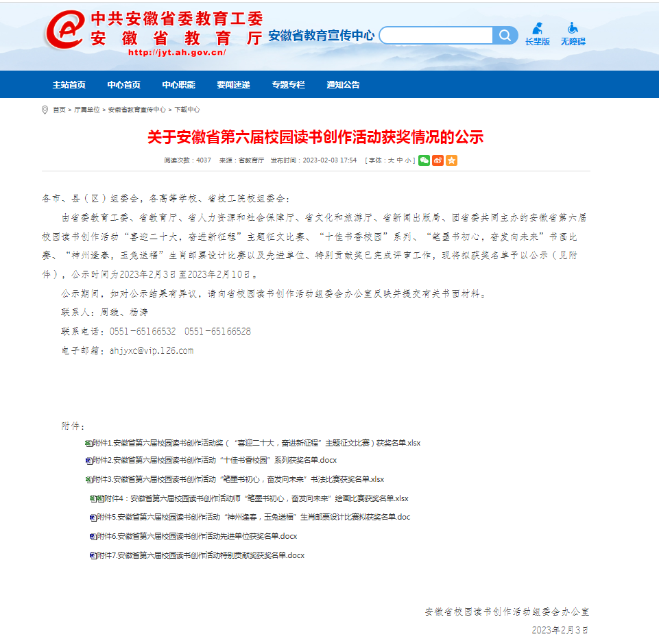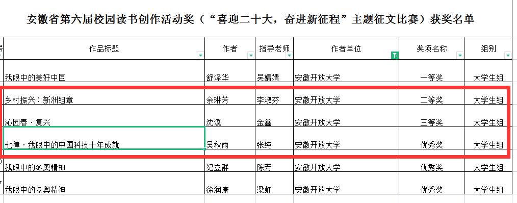 近日,安徽省第六届校园读书创作活动获奖情况公布,我校师生踊跃参与,再创佳绩,选送的5篇“喜迎二十大,奋进新征程”主题征文作品均斩获奖项。