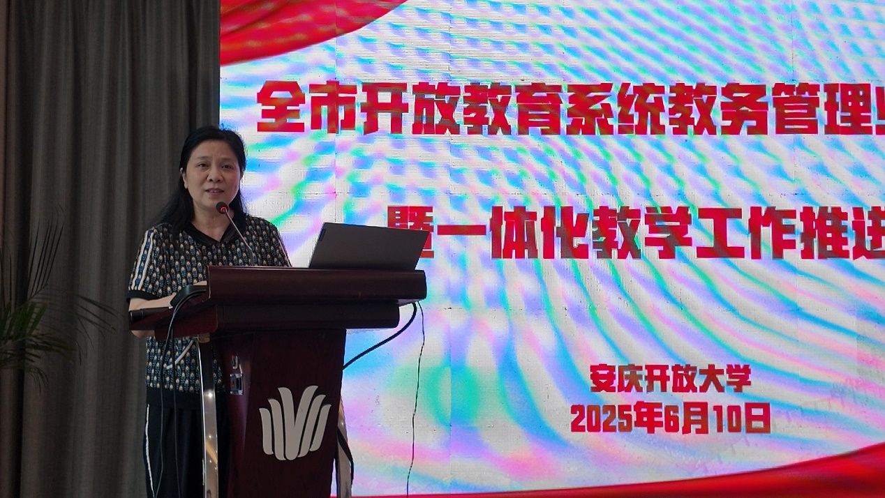 陈庆玲在讲话中结合国家开放大学和安徽开放大学《综合改革方案》的要求,从质量、服务、一体化三个角度,对举办本次培训的初衷进行了高度阐释。她指出,开放教育事业是各校办学业务的主体,教务工作作为学校教学管理的核心环节,承载着保障教学质量、推动教学改革、服务师生的重要使命。她相信在开大各位领导和同事们的共同努力下,培训一定能有效地提升教务管理队伍的专业素养、优化教务工作流程、提高工作效率、保障学校各项工作高质量开展。