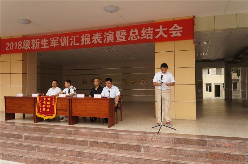 最后,职成处主任程学刚致辞向本次军训的教官们表示衷心的感谢,向圆满完成军训任务的老师和同学们表示亲切的慰问和热烈的祝贺!他指出,军训生活不仅是对同学们体能的训练,更是对同学们意志的磨练。本次军训培养了我校学生不怕困难、艰苦奋斗的理想信念,增进了全体学生的爱国主义热情。他要求2018级新生,在未来的学习生活中,要将军训的收获和体会内化为成长成才的正能量,不忘初心、继续前进,以铁的纪律和永不言败的奋斗精神,以饱满的热情投入到学习知识、学习做人、学习技能的实践中去,文武兼修,努力学习,以精益求精的精神去宏扬工匠精神,谱写精彩的人生华章,为学校争光。