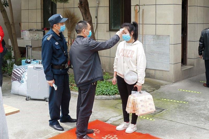 上午,学生戴着口罩有序进入校门,根据地上的警戒线,前后保持间隔1米,教师检测体温后分散进入校园。