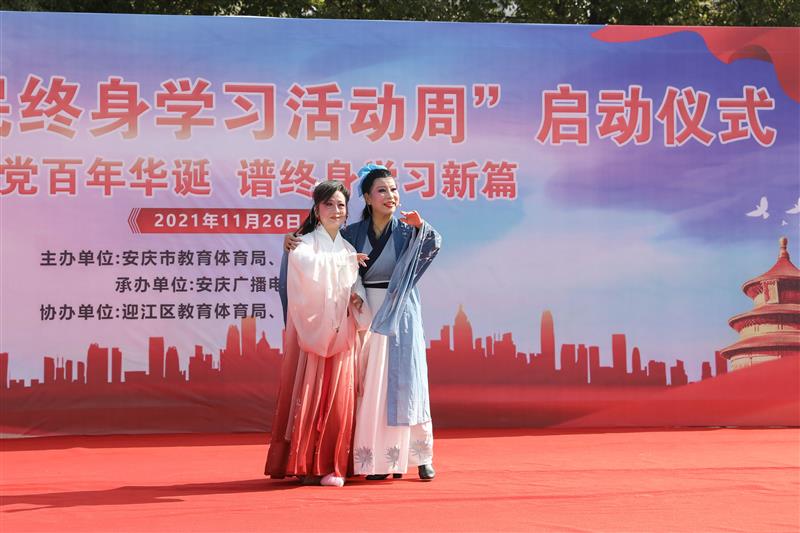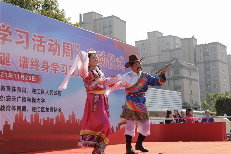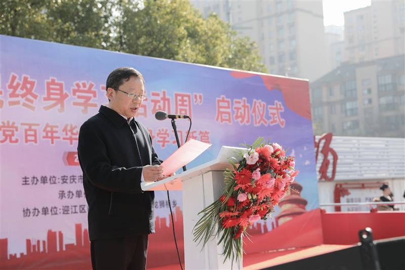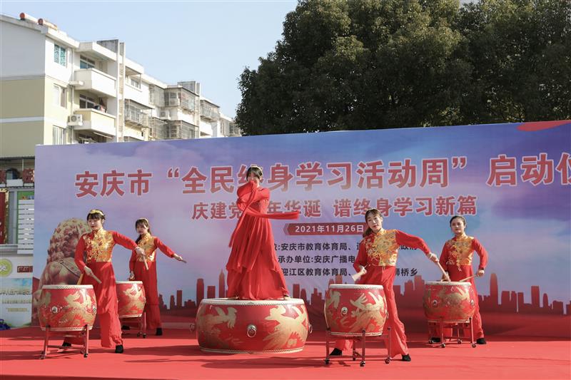 11月26日上午10点,2021年安庆市全民终身学习活动周启动仪式在迎江区龙狮桥乡雨润社区举行。本次活动周主题为“庆建党百年华诞  谱终身学习新篇”,由安庆市教育体育局、迎江区人民政府主办,安庆广播电视大学承办,迎江区教体局、龙狮桥乡协办。民进安庆市主委、安庆市教体局副局长潘连宇出席并讲话,迎江区政府副区长孟泽婧代表主办方致辞,安庆电大党委书记、校长曹劲松宣布安庆市“百姓学习之星”“终身学习品牌项目”评选结果。本次活动周旨在动员更多部门和社区积极参与到社区教育发展事业中来。