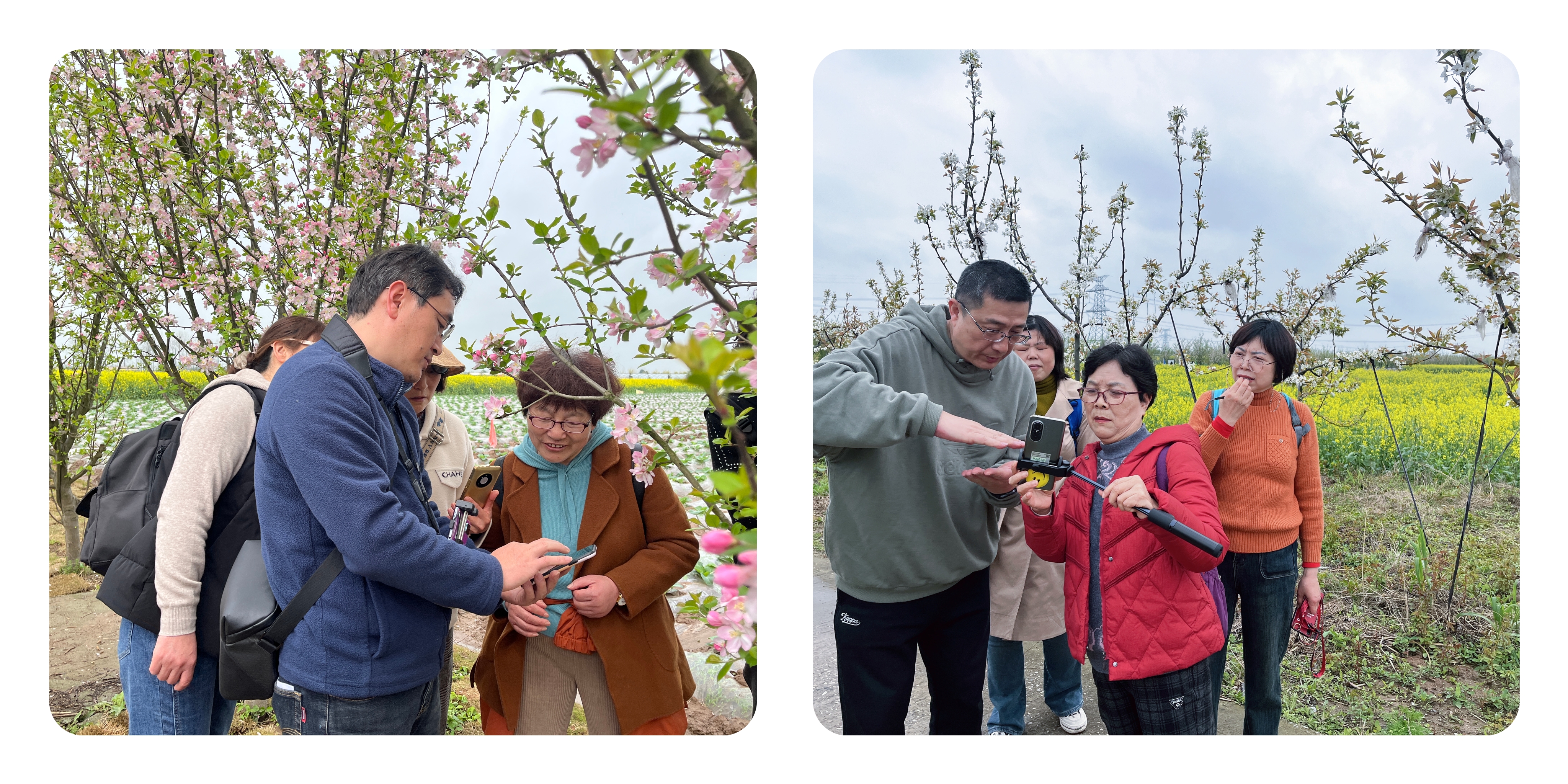 在本次活动中,由手机摄影班老师程学刚现场为学员讲解关于摄影中的构图、取景、曝光、用光和影调等方面的知识和技巧;短视频制作班老师庞涛详细介绍了短视频拍摄中的转场和运镜等技巧和方法,让老年学员们受益匪浅。在每一个拍摄点,大家都认真思考,精心构图,积极提问与交流。