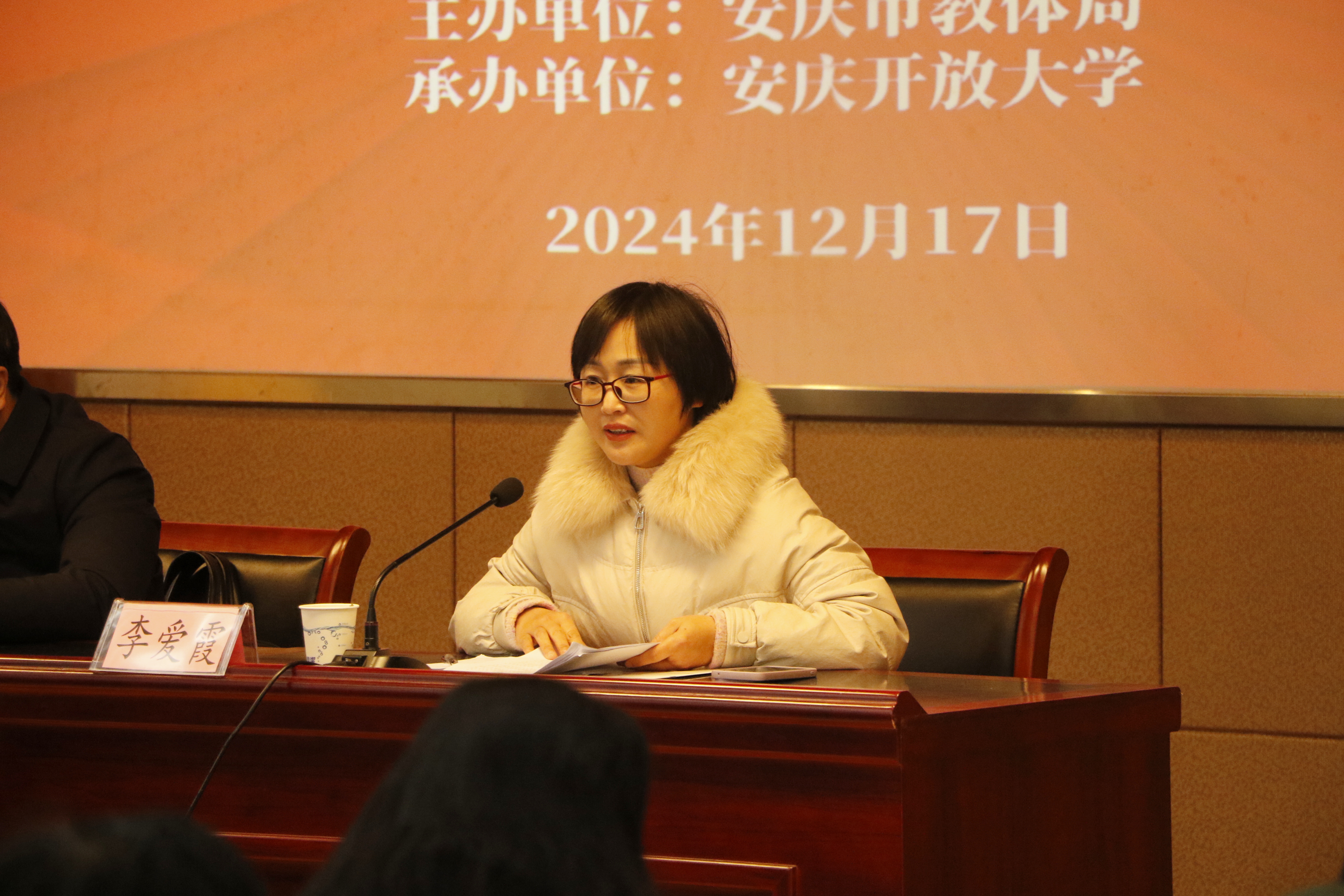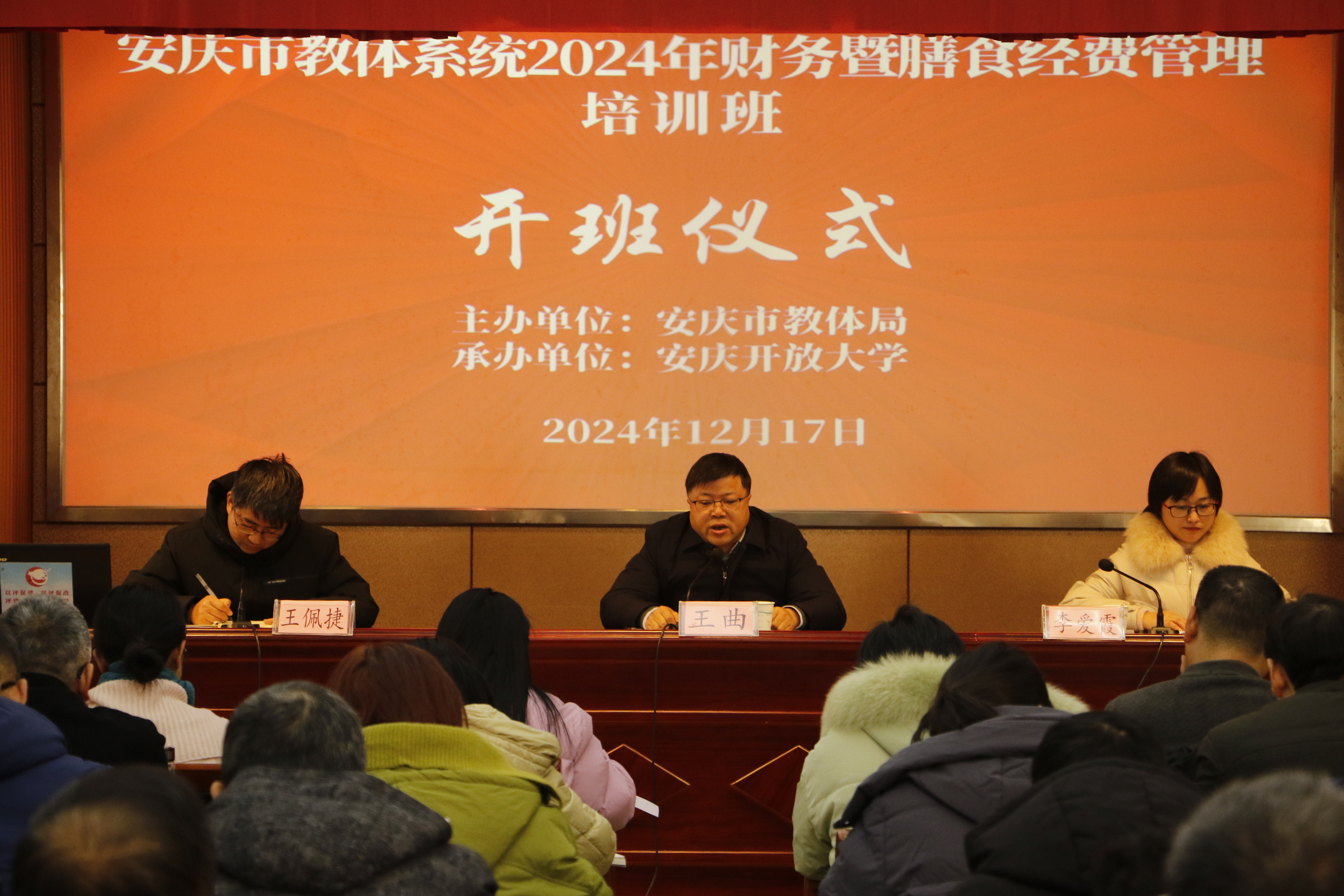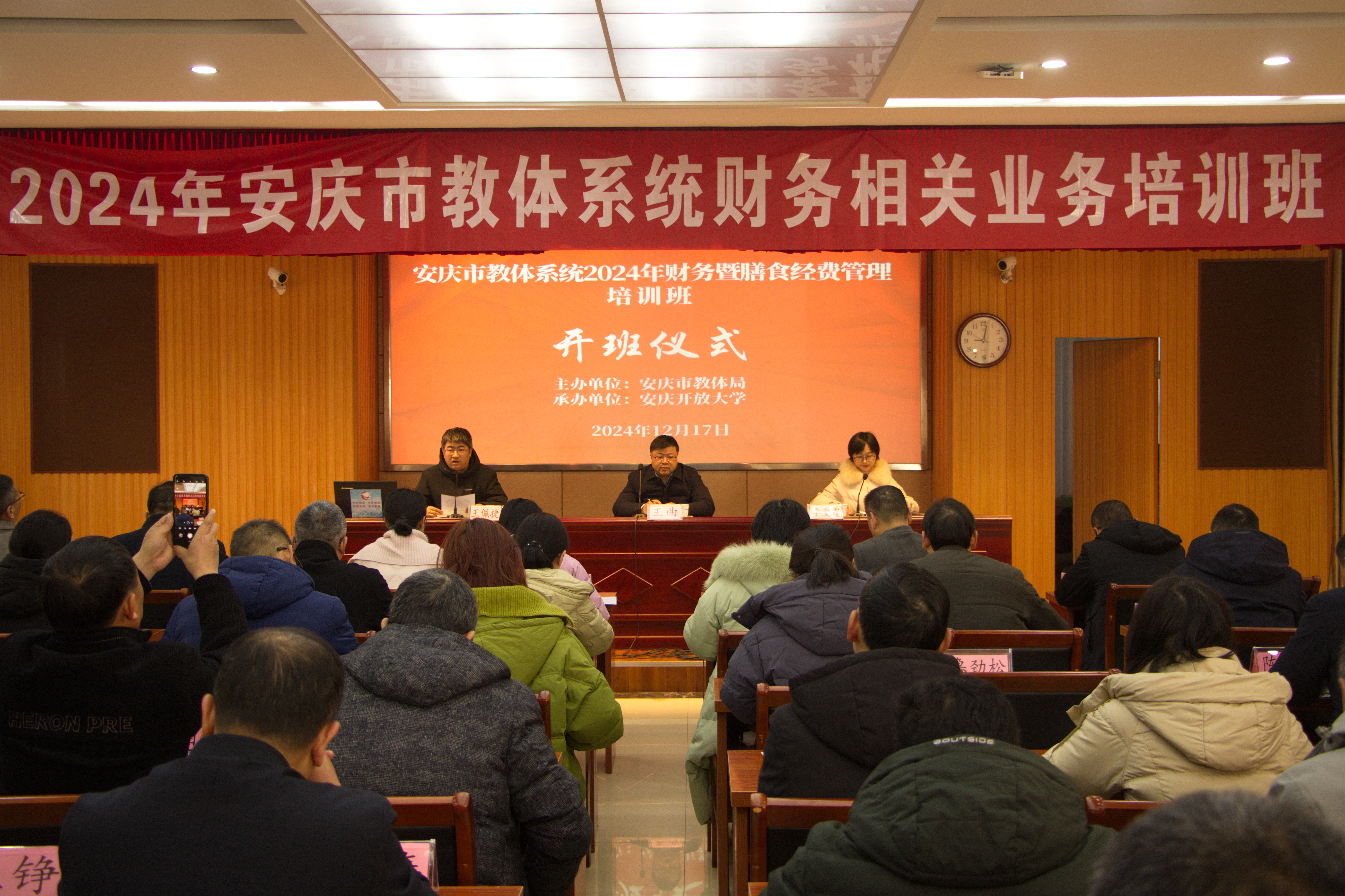 为进一步提升我市教体系统财务相关人员专业能力,打造一支高素质、专业化的财务管理队伍,12月17上午,安庆市教体系统2024年财务暨膳食经费管理培训班在我校举办。市委教体工委委员、总督学王曲、市教育体育局财务科科长李爱霞出席开班仪式,各县(市、区)教育主管部门分管负责人、财务、营养餐、项目建设、固定资产管理等相关业务负责人约90人参训,会议由安庆开放大学党委副书记、校长王佩捷主持。