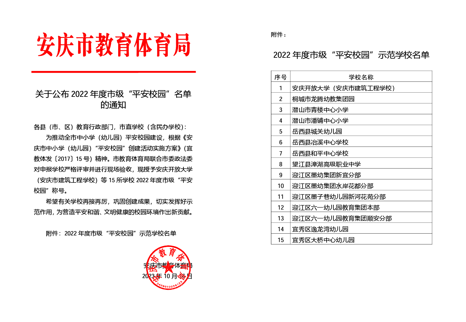根据《安庆市中小学(幼儿园)“平安校园”创建活动实施方案》(宜教体发〔2017〕15号)精神。市教育体育局联合市委政法委对申报学校严格评审并进行现场验收,授予安庆开放大学(安庆市建筑工程学校)2022年度市级“平安校园”称号。