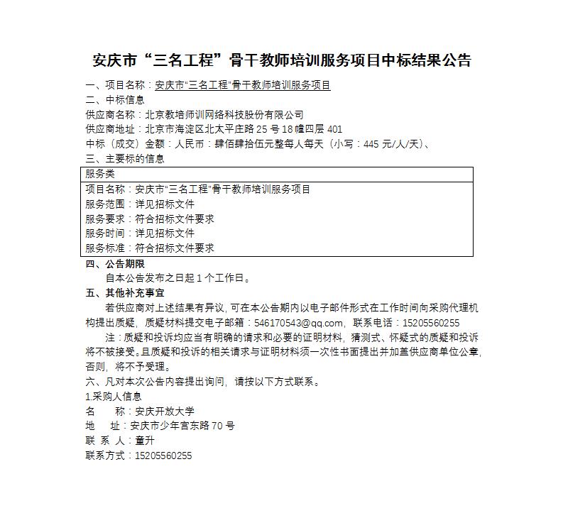 安庆市“三名工程”骨干教师培训服务项目中标结果公告