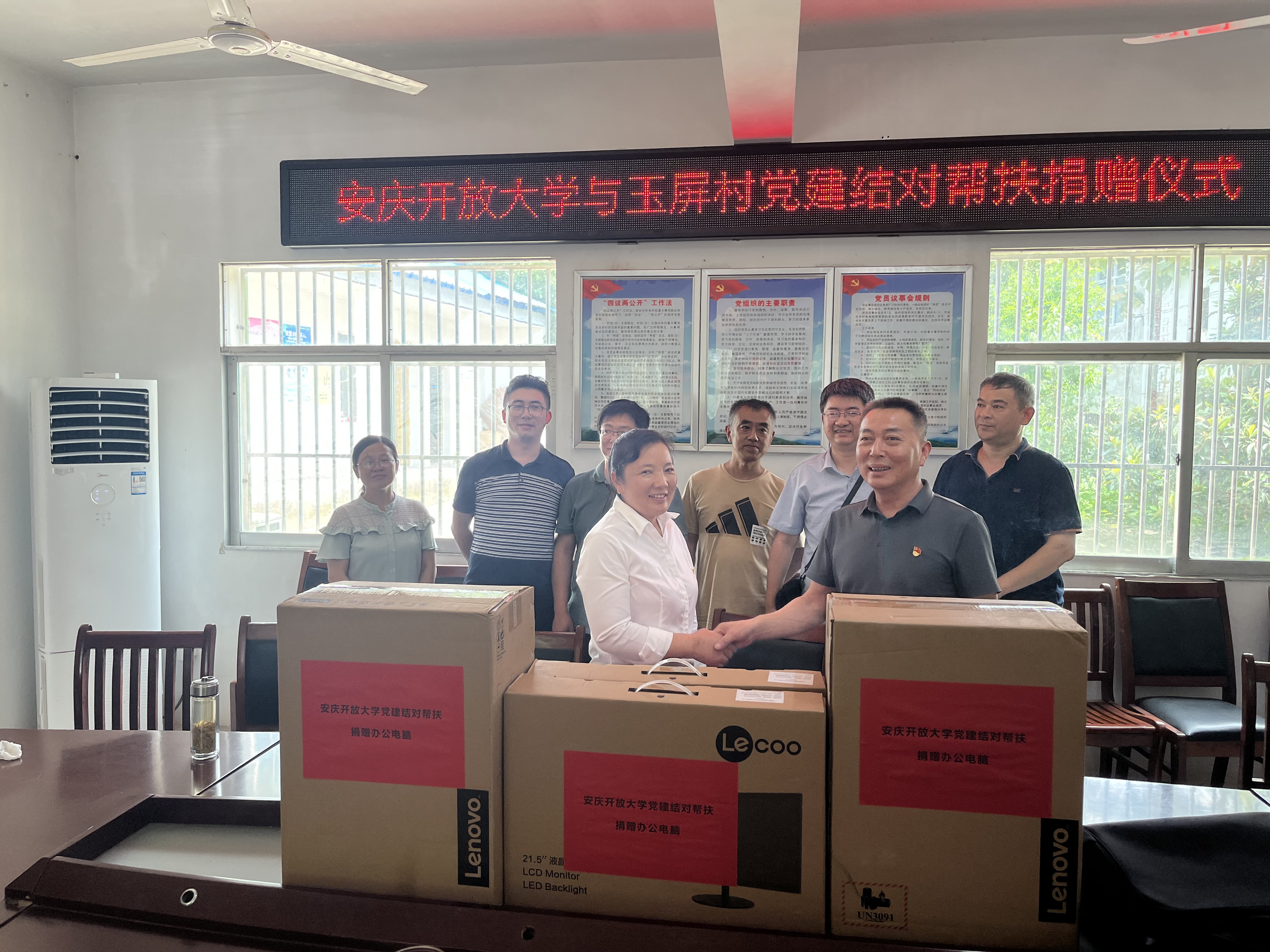 在村党员活动室,双方共同签订了结对共建协议,围绕人员构成、组织建设和未来合作开展等方面进行了深入交流。学校向玉屏村捐赠四台电脑设备,助力玉屏村党总支党建信息化建设和乡村振兴工作的开展。