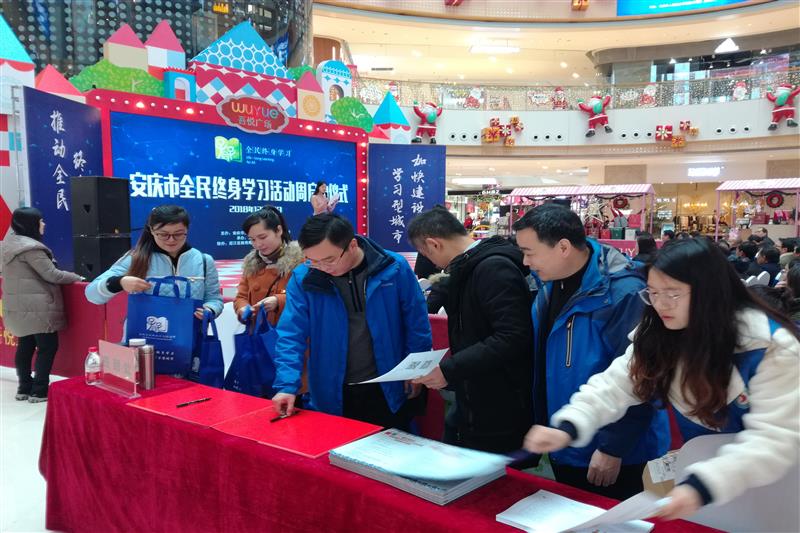 12月20日上午,由安庆市教育体育局、迎江区人民政府主办,我校承办的2018年安庆市“全民终身学习活动周”启动仪式在迎江区新河路街道新河社区吾悦广场一楼中庭内广场举行。第三党支部按照“市直教体系统‘党建品牌’创建工作计划表”的要求,组织全体党员在启动仪式上开展了“构建全民终身学习体系,普及终身教育理念,推进全民学习、终身学习的学习型社会建设”宣传服务活动。