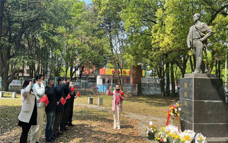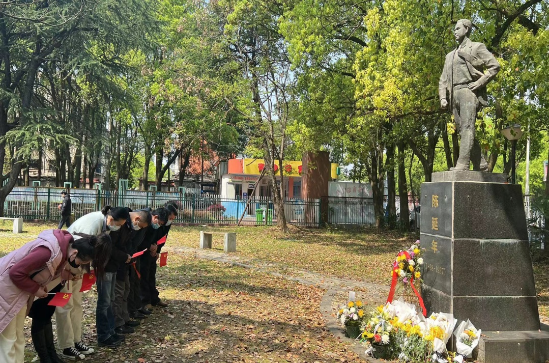 4月2日上午,第三党支部手捧党旗和鲜花来到了位于安庆市青少年宫内的陈延年雕像前,祭奠、缅怀这位“以己青春之生命,延华夏之华年”的伟大革命烈士。