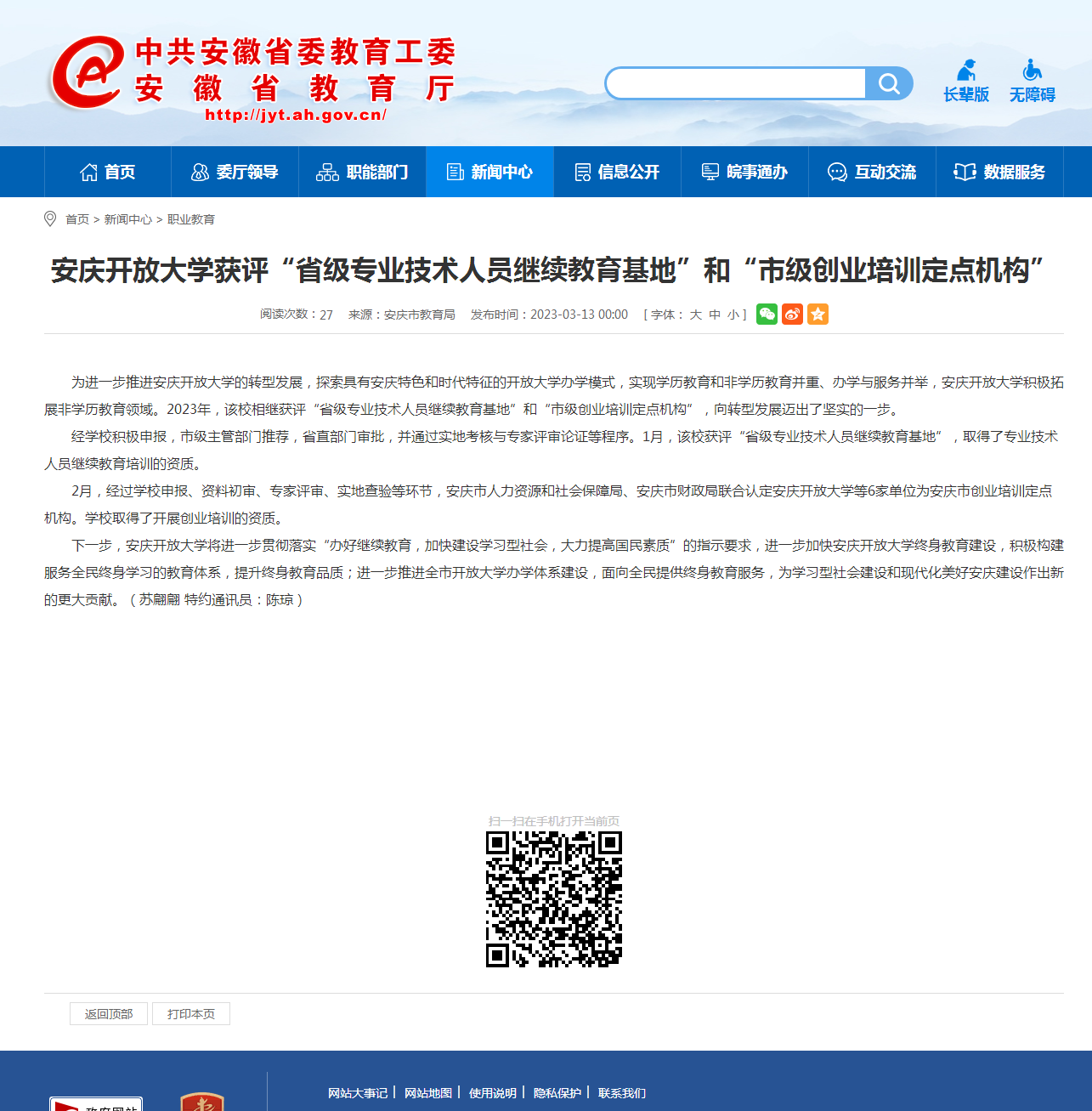 安徽教育网:安庆开放大学获评“省级专业技术人员继续教育基地”和“市级创业培训定点机构”