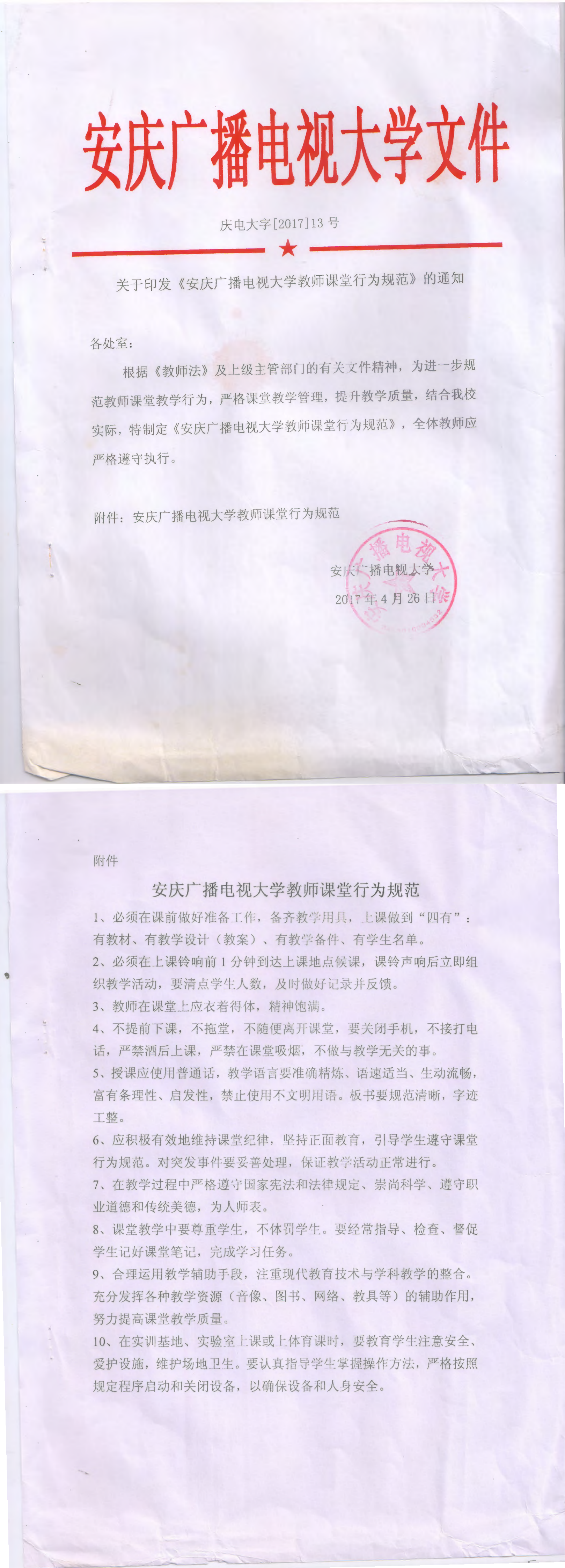 [2017]13号关于印发《安庆广播电视大学教师课堂行为规范》的通知