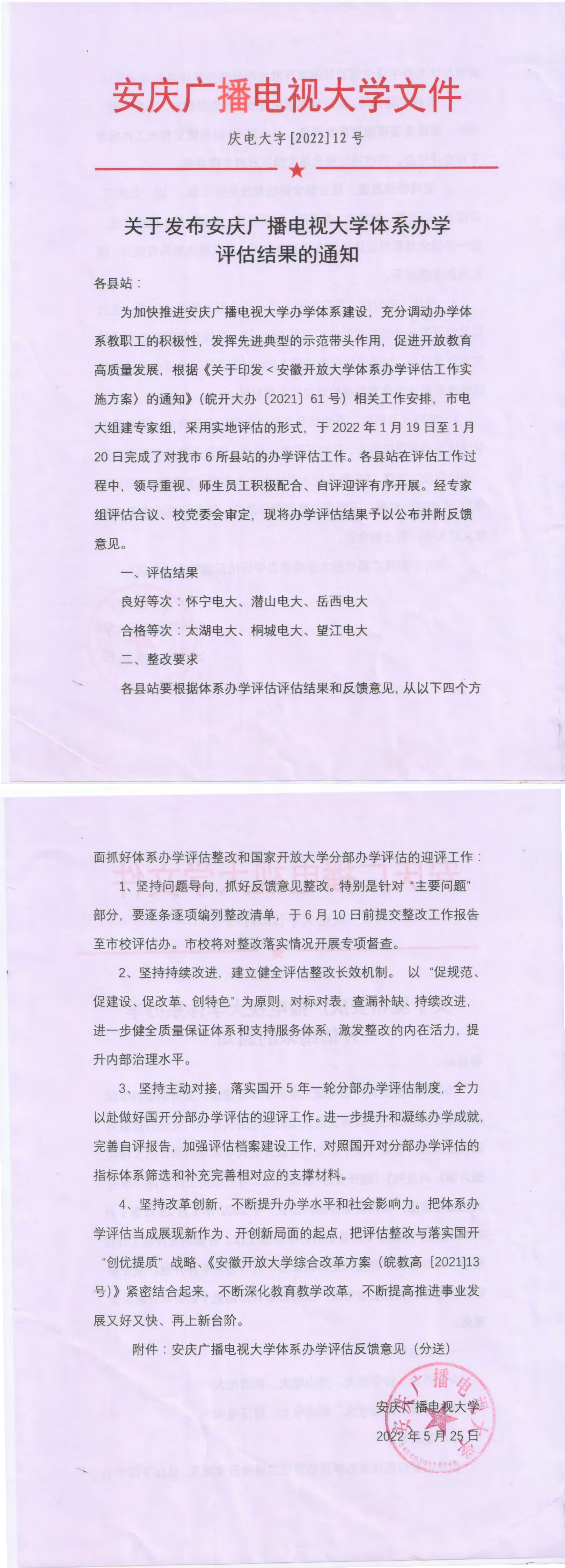 关于发布安庆广播电视大学体系办学评估结果的通知【2022】12号