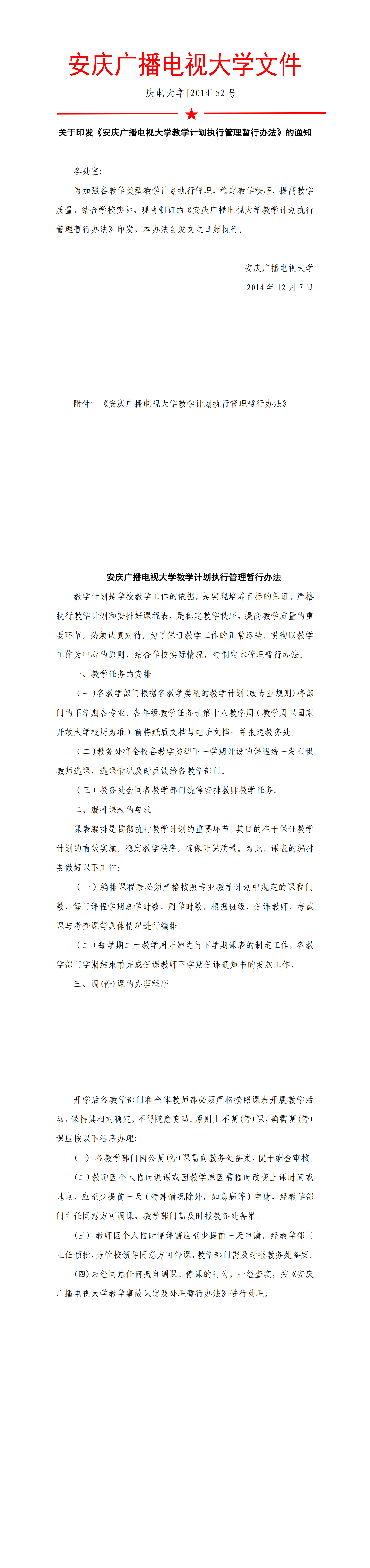 [2014]52 号关于印发《安庆广播电视大学教学计划执行管理暂行办法》的通知