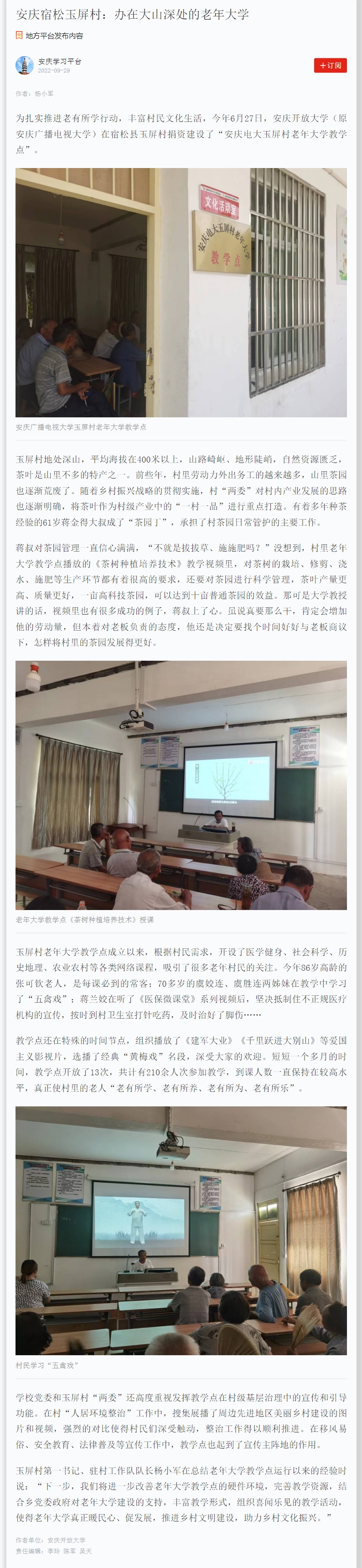 原文链接:安庆宿松玉屏村:办在大山深处的老年大学 (xuexi.cn)