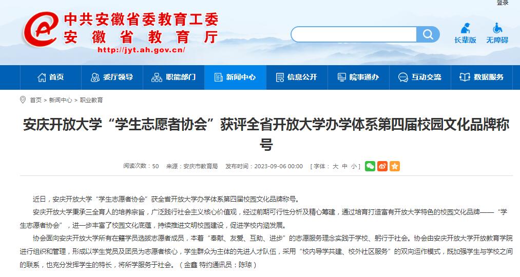 安徽教育网:安庆开放大学“学生志愿者协会”获评全省开放大学办学体系第四届校园文化品牌称号