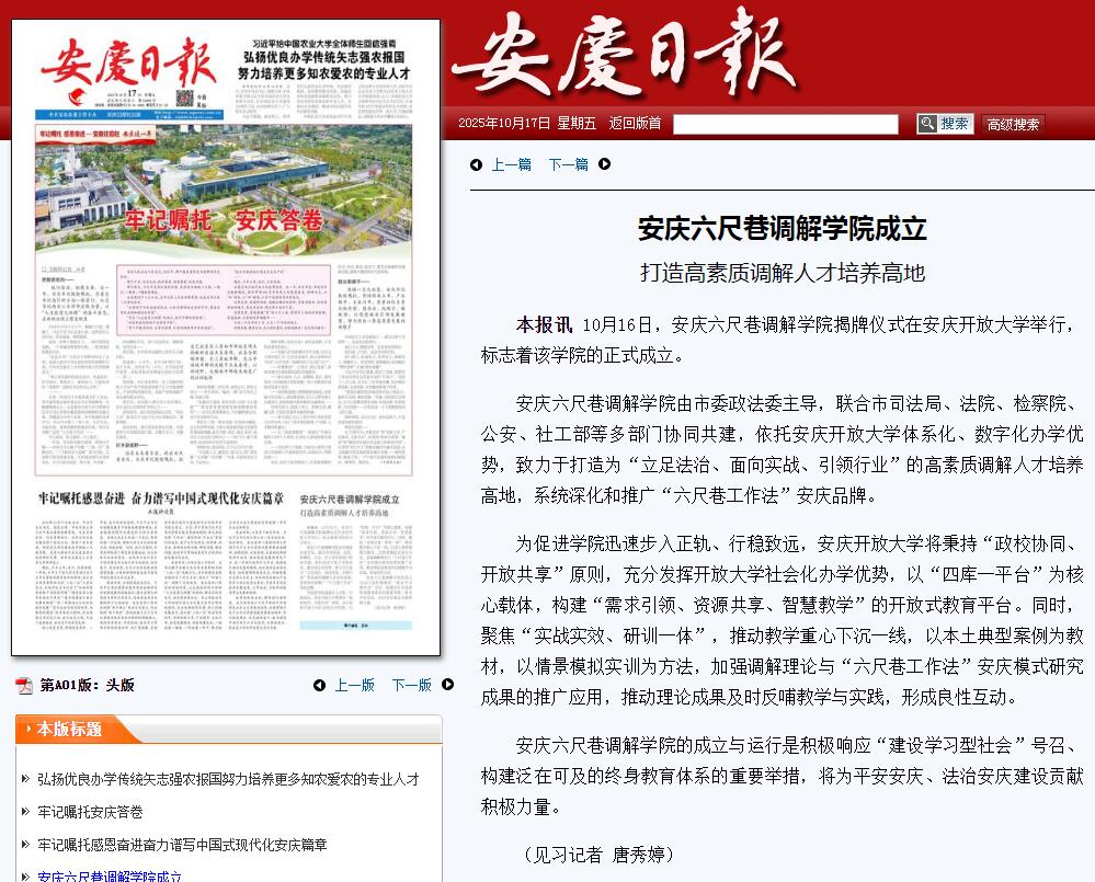 安庆日报:安庆六尺巷调解学院成立