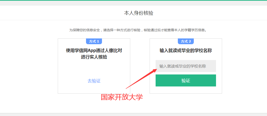 第四步:本人身份核验,输入“国家开放大学”